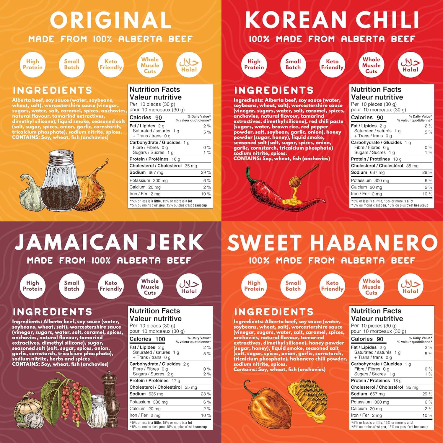 透過我們的什錦包探索牛肉乾工藝的巔峰以及來自世界各地的口味。我們的牛肉乾採用優質整塊牛肉製成,並經過完美醃製,確保每次吃起來都鮮嫩可口。我們的什錦包有四種口味,可以滿足每一種渴望:原味:經典而永恆,這種牛肉乾擁有濃鬱可口的口感,突出了我們優質牛肉的天然風味,並加入了大量的碎黑胡椒。牙買加牛肉乾:充滿活力的混合溫暖的香料創造出一種大膽的味道,將您的味蕾直接帶到加勒比海。韓國辣椒:加入了韓式辣椒醬、韓國辣椒片和少許蜂蜜,這種味道在溫和的辣味和鮮味之間達到了令人愉悅的平衡。甜哈瓦那辣椒:真正的蜂蜜的甜味與火辣的哈瓦那辣椒完美搭配,帶來令人垂涎的味覺體驗。