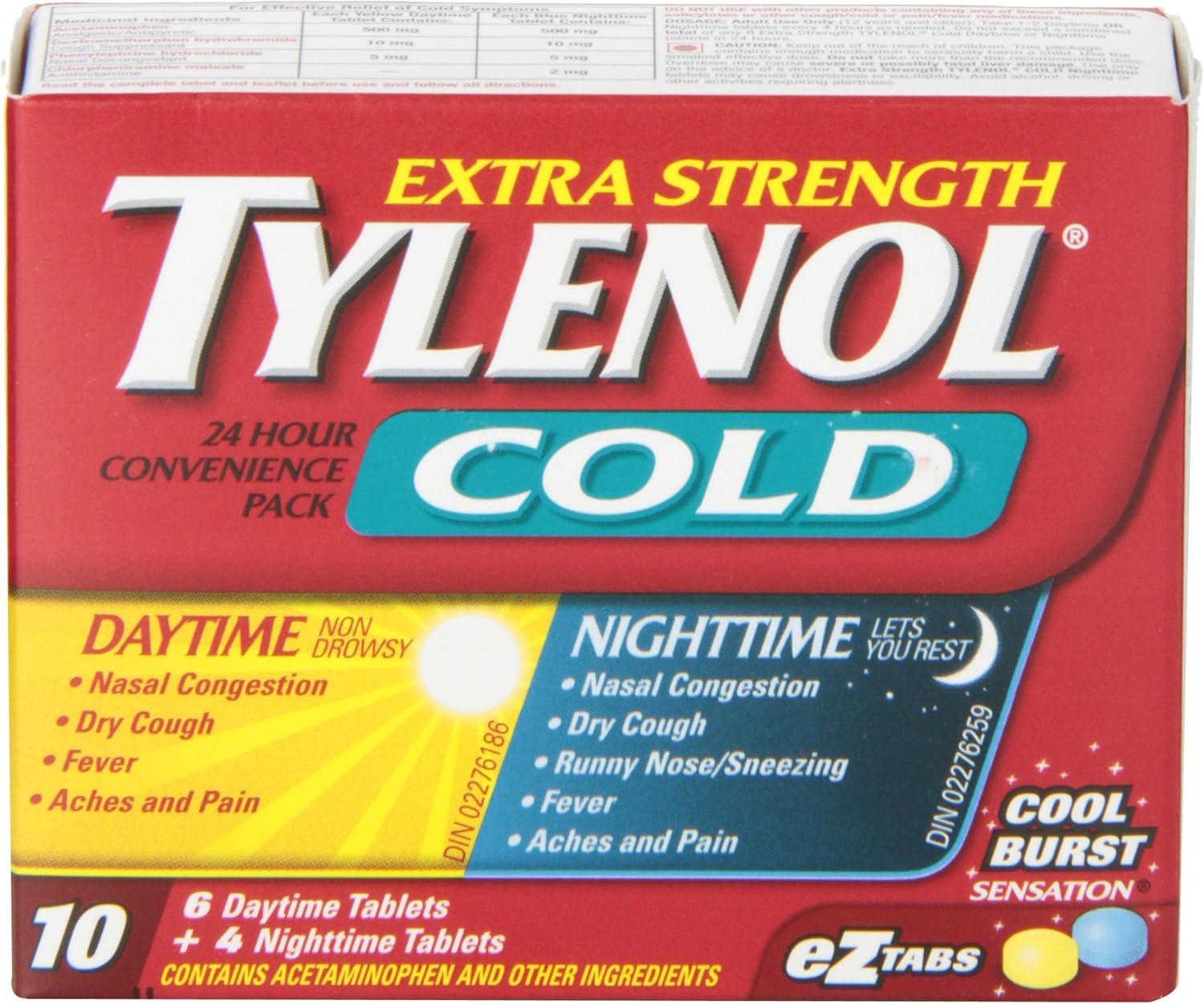 泰諾強效感冒藥日間+夜間清涼速效eZ片,6片裝+4片裝,可緩解感冒症狀,讓您恢復正常,無論感冒是什麼症狀。有效緩解鼻塞、乾咳、發燒、全身疼痛、流鼻水和打噴嚏(僅限夜間)。每包含10片:6片日間片和4片夜間片;eZ片裝易於吞嚥,快速有效緩解症狀。每片日間片和夜間片均含有500毫克對乙醯氨基酚,有助於緩解疼痛和退燒;10毫克氫溴酸右美沙芬用於止咳;以及5毫克鹽酸苯腎上腺素用於緩解鼻塞。每片夜間片還含有2毫克馬來酸氯苯那敏,作為抗組織胺藥,用於緩解流鼻涕和打噴嚏。夜間緩解症狀,讓您安心休息。