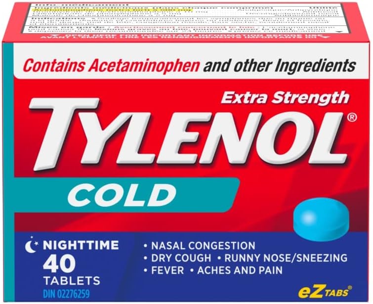 泰諾感冒強效夜間用片有助於緩解感冒症狀。有效緩解一般感冒或流感引起的鼻塞、乾咳、發燒、全身疼痛、流鼻水和打噴嚏等症狀。無論您的日常生活如何,都能恢復正常。每片藍色藥片含有500毫克對乙醯氨基酚,有助於緩解疼痛和退燒;10毫克氫溴酸右美沙芬,有助於抑制咳嗽;5毫克鹽酸苯腎上腺素,有助於緩解鼻塞;以及2毫克馬來酸氯苯那敏(抗組胺藥),有助於緩解流鼻水和打噴嚏。採用易於吞嚥的片劑形式。成人及12歲以上兒童,視需要每4小時服用1-2片夜用片。 24小時內請勿超過8片。