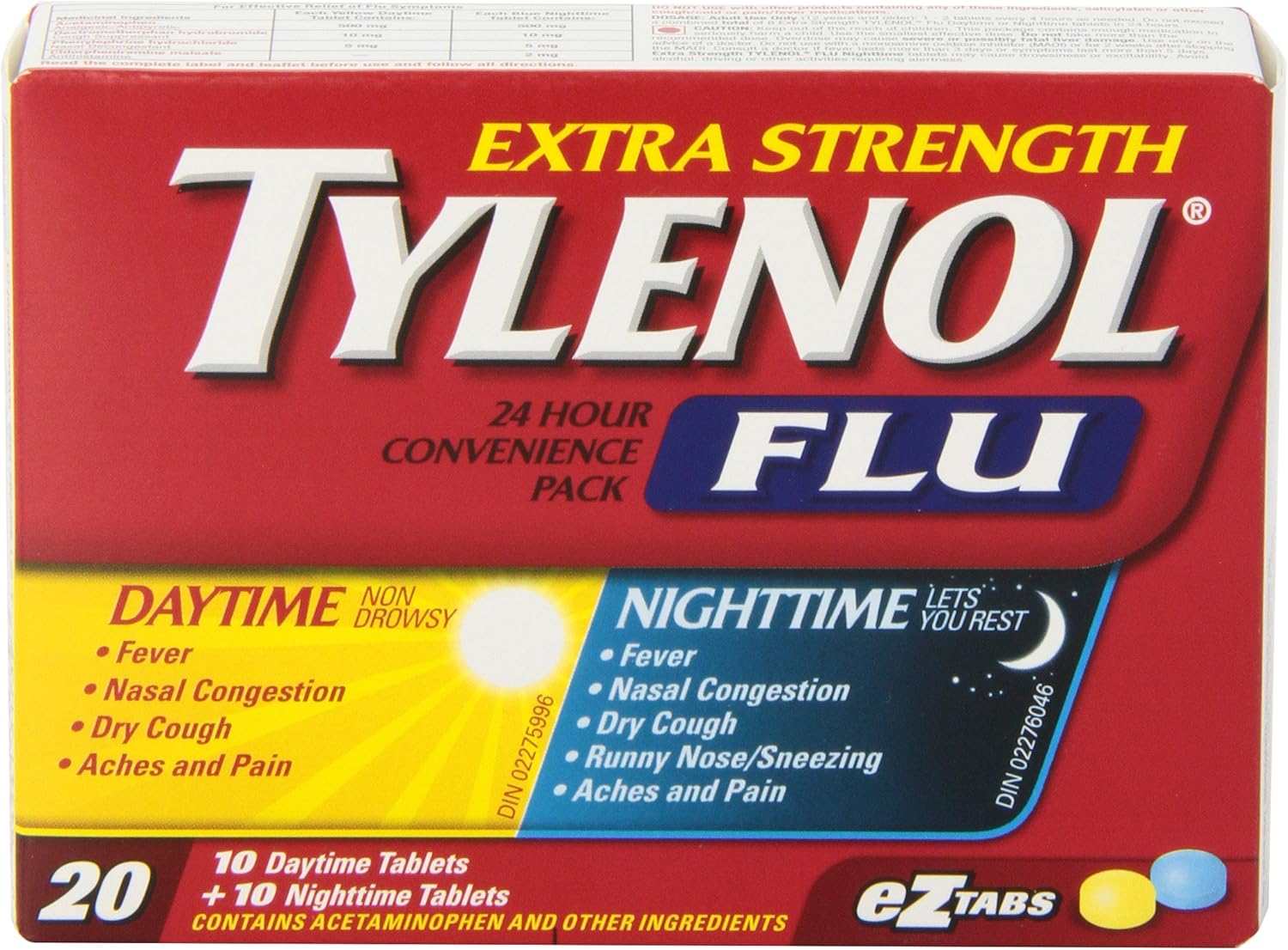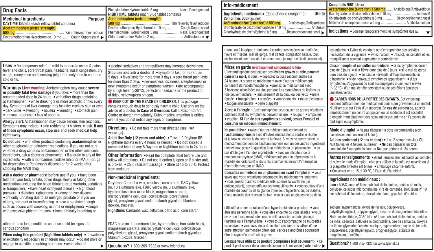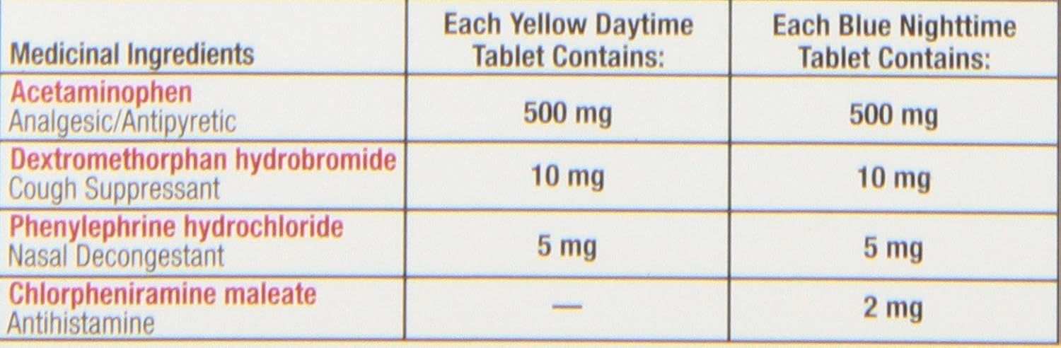 泰諾強效日夜流感片,20片裝,幫助您日夜緩解流感症狀。每片含500毫克對乙醯氨基酚(用於緩解疼痛和發燒)、10毫克氫溴酸右美沙芬(用於止咳)和5毫克鹽酸苯腎上腺素(用於緩解鼻塞)。夜間藥片添加了2毫克馬來酸氯苯那敏(一種抗組織胺),用於緩解流鼻水和打噴嚏。這些易於吞嚥的藥片可緩解鼻塞、乾咳、發燒和全身疼痛。強效泰諾日夜流感片每包20片:10片日用藥片及10片夜用藥片。成人及12歲以上兒童,視需要每4小時服用1-2片日用藥片或夜間用藥片。 24 小時內日間或夜間服用的藥片總數不得超過 8 片。