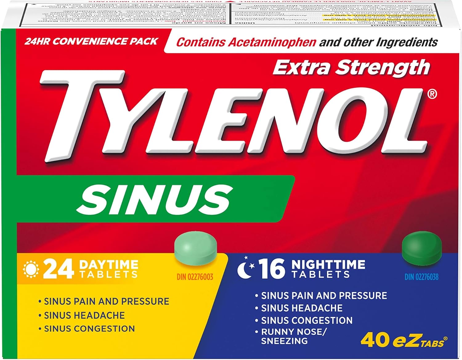 泰諾強效日夜組合,24+16片裝,有助於緩解您白天和夜間的鼻竇症狀。快速有效地緩解感冒或流感引起的鼻竇疼痛和壓力、鼻竇性頭痛、鼻竇充血、全身疼痛以及流鼻水和打噴嚏(僅限夜間)等症狀,讓您呼吸更順暢。每片日夜藥片含有 500 毫克對乙醯氨基酚,有助於緩解疼痛和退燒,5 毫克鹽酸苯腎上腺素用於緩解鼻塞。夜間藥片還含有 2 毫克馬來酸氯苯那敏,作為抗組織胺藥,用於流鼻涕和打噴嚏。僅限成人使用(12 歲以上)。根據需要,每 4 小時服用 1-2 片。 24 小時內總服用量不得超過 8 片。服用泰諾,緩解最重要的症狀。