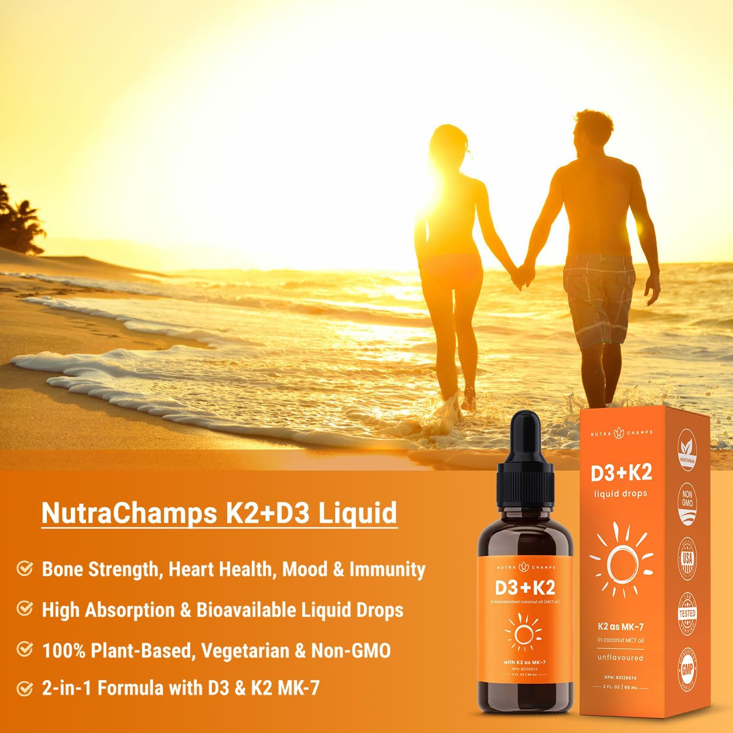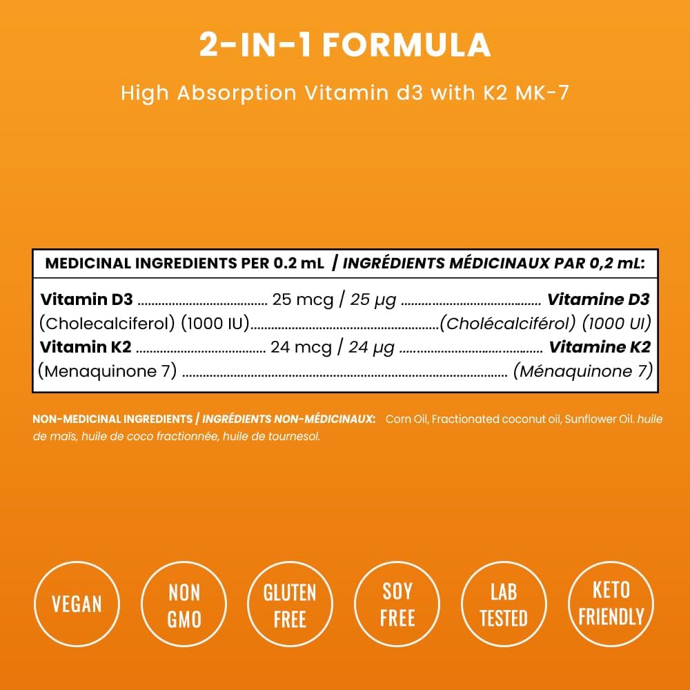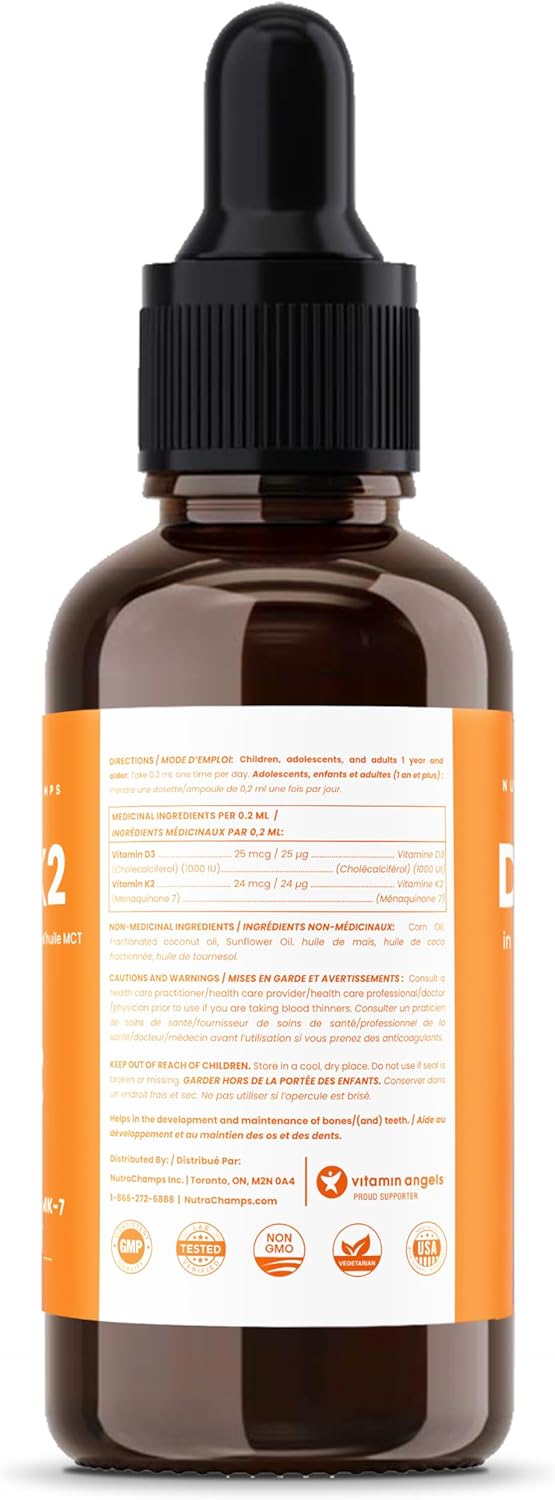 兒童及成人維生素 D3 K2 滴劑 | 每 0.2 毫升含 1000 國際單位 D3 | 60 毫升 | 液體維生素 D3 K2 與 MK7 混合,溶於 MCT 油中,促進吸收 | 骨骼、心臟、免疫健康 | 無味