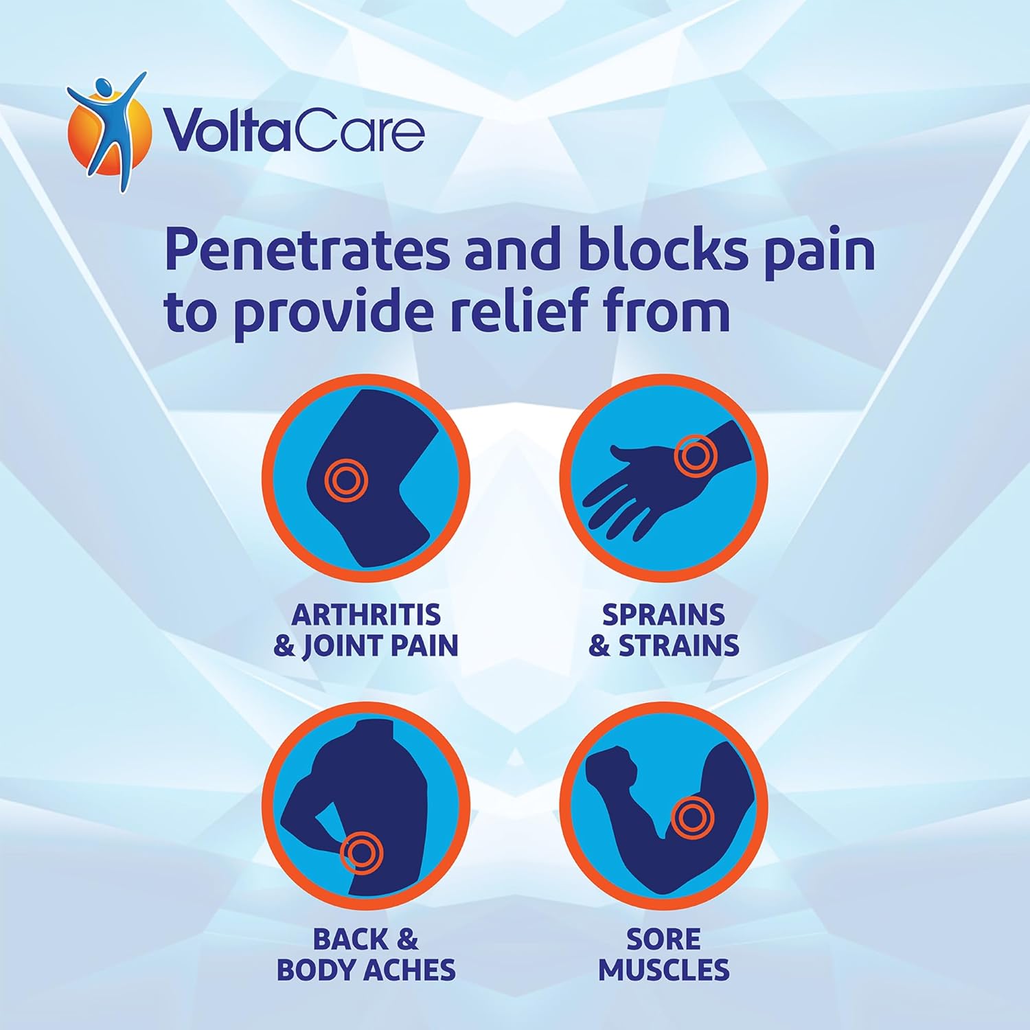 產品說明:扶他林 (Voltaren) 出品的 VoltaCare 清涼止痛膏,蘊含四種止痛成分,可快速緩解肌肉、關節和背部疼痛。塗抹後即可感受到清涼感。它蘊含四種活性成分——薄荷醇、辣椒素、樟腦和水楊酸甲酯——能夠靶向並阻斷疼痛,緩解背痛、關節炎、關節痛、扭傷、拉傷和肌肉酸痛。為確保產品適合您,請務必閱讀並遵循標籤說明。