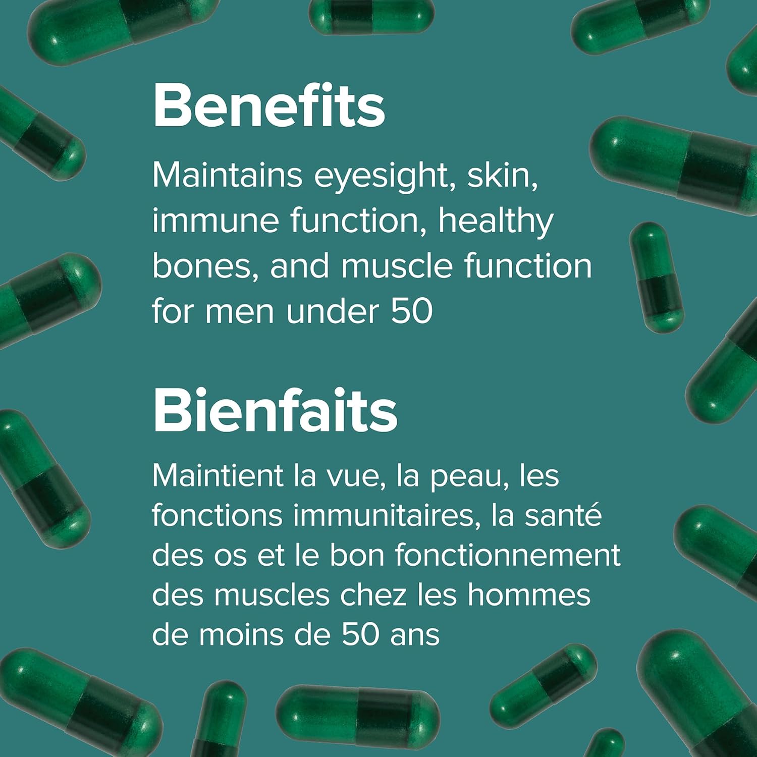 男士最全面的多種維生素是一種每日一粒的配方,以全食物為基礎,提供建議的維生素,以維持 50 歲以下男性的視力、皮膚、免疫功能、健康的骨骼和肌肉功能。每粒易於吞嚥的膠囊都含有來自非基因改造來源的 55 多種營養素,適合素食者。