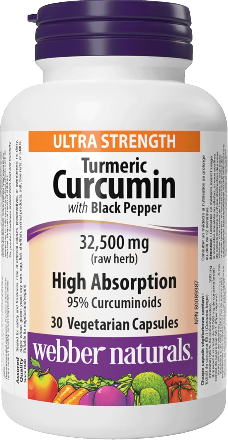 韋伯天然 (Webber Naturals) 的強效薑黃素採用抗氧化配方,有助於緩解關節疼痛和其他炎症,同時維持健康的血清甘油三酯水平。每粒素食膠囊蘊含 500 毫克 65:1 強效薑黃萃取物,相當於 32,500 毫克生薑黃,並添加 5 毫克黑胡椒萃取物,以增強吸收——這是我們迄今為止功效最強的薑黃配方!
