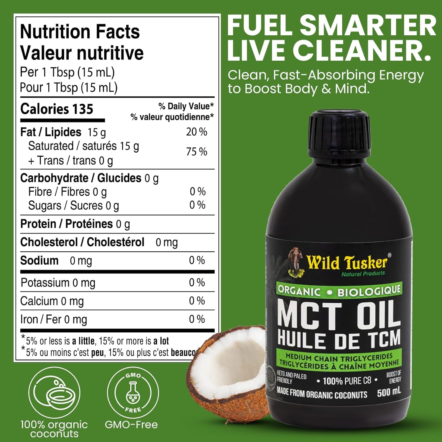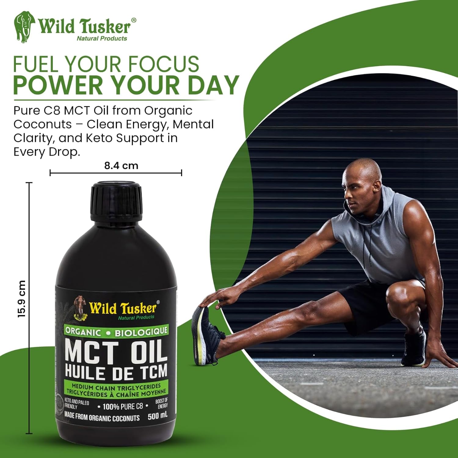 Wild Tusker 有機優質 MCT 油(分餾椰子油),100% C8 辛酸,500 毫升 | 非基因,冷壓,不含任何化學物質 | 生酮友好,猶太潔食認證,素食