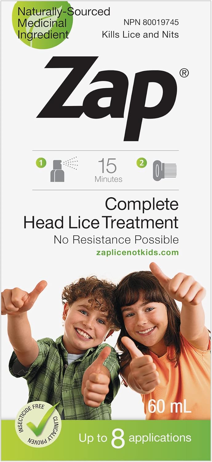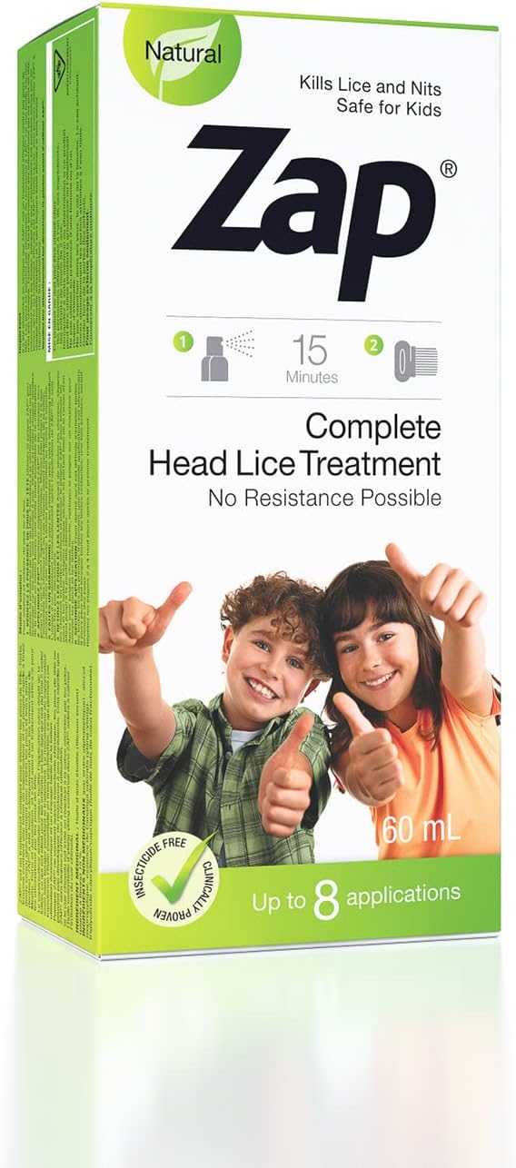 Zap 是一款全面的頭蝨治療產品。每盒 Zap 都包含一瓶噴霧乳液和一把專門用於清除蝨子及其卵的硬質細齒梳。由於 Zap 是非化學作用方式,蝨子不會對它產生抗藥性。