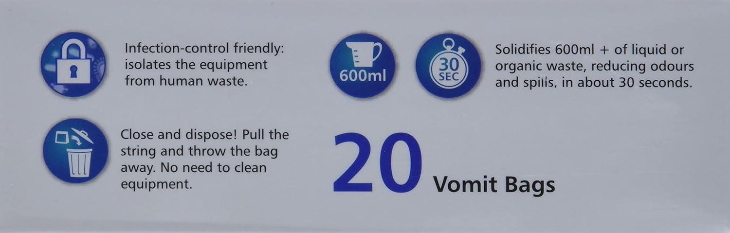 Zorbi 可生物降解嘔吐袋是一種衛生、便捷、高效的液體人體排泄物處理方法,可最大程度地減少其與設備和工作人員的接觸。與那些最終被丟棄在垃圾掩埋場的再生塑膠嘔吐袋不同,這些可生物降解嘔吐袋在丟棄後的幾個月內即可在垃圾掩埋場開始分解。每個白色的 Zorbi 嘔吐袋都包含一個由高吸水性粉末製成的速效墊。接觸液體後,只需 30 秒,這款高吸水性墊即可膨脹至可容納 600 毫升有機液體,然後凝固成凝膠狀。這不僅能有效降低溢出風險,還能鎖住異味並抑制細菌。 Zorbi 嘔吐袋配有方便的拉繩封口,可與普通垃圾一起快速輕鬆地處理。非常適合在搭乘飛機、長途汽車或沒有洗手間時容易暈車的人士使用。這些一次性嘔吐袋有助於控制感染,降低交叉污染風險,並使照護者和工作人員更容易控制和控制液態人體排泄物。包裝內含20個可生物降解嘔吐袋及20片速效墊。型號:764-127規格:商品重量:0.1磅。商品重量:0.1磅。尺寸:9.8吋 x 9.8吋 x 0.1吋。尺寸:9.8吋 x 9.8吋 x 0.1吋。