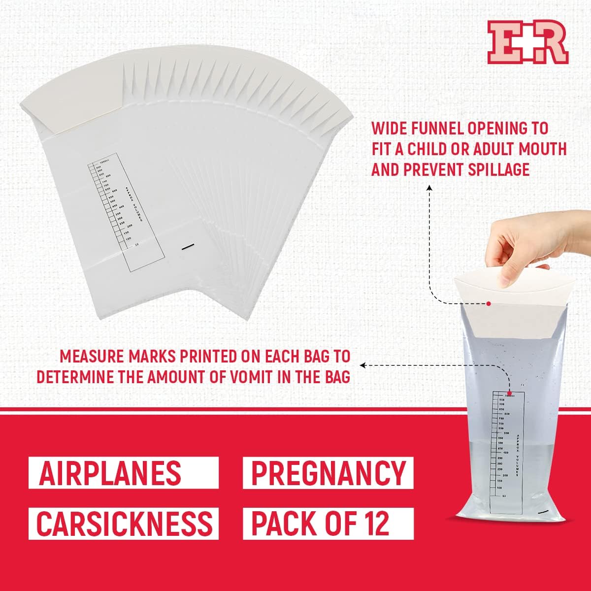 Ever Ready 急救嘔吐袋,附漏斗和防漏止回閥,適用於旅遊、計程車、暈車、孕婦、兒童等 - 12 個裝