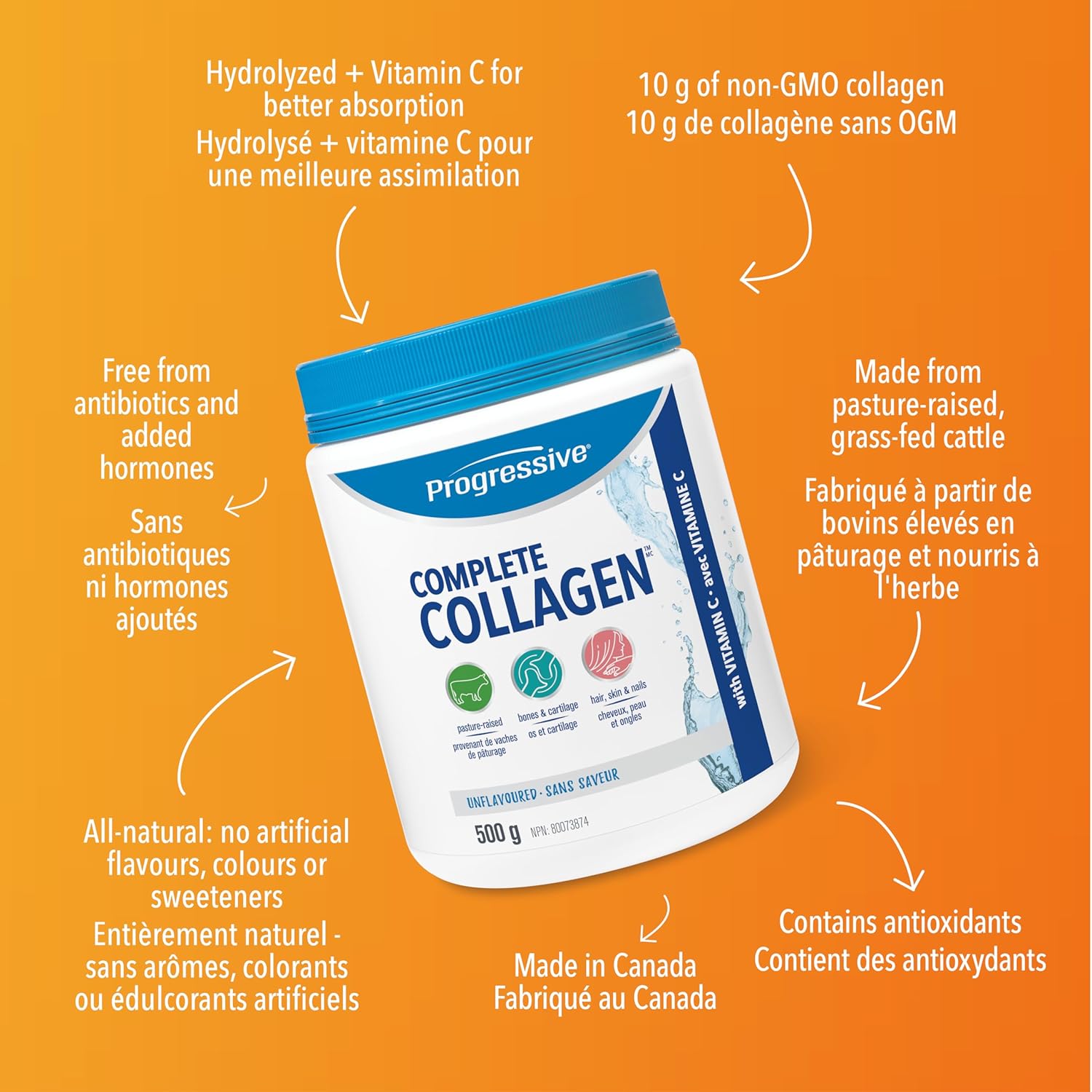 Progressive 完整膠原蛋白,無味,加拿大製造,有益於頭髮、皮膚、指甲和關節健康。草飼非基因,富含抗氧化劑,經維生素C水解,促進吸收,500克