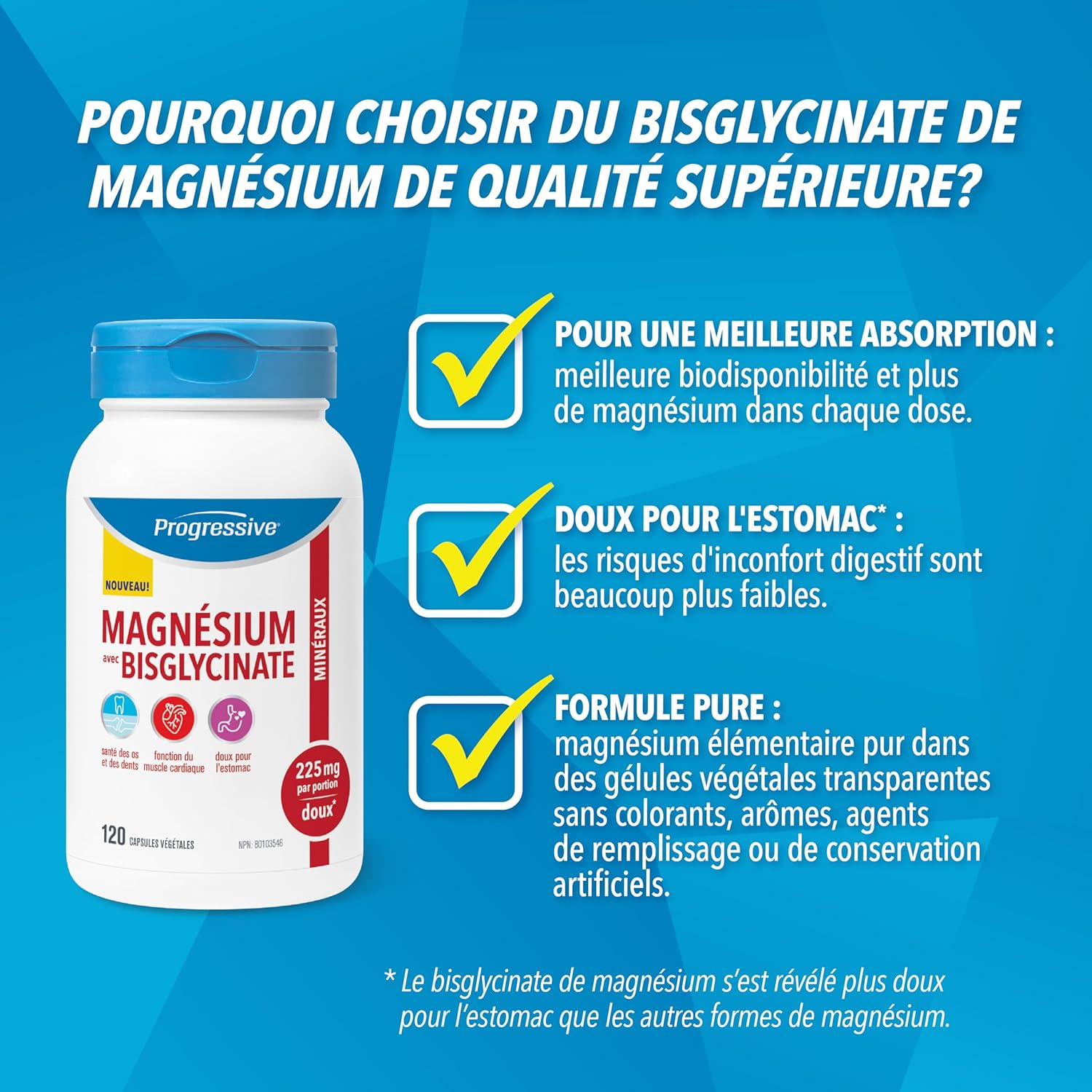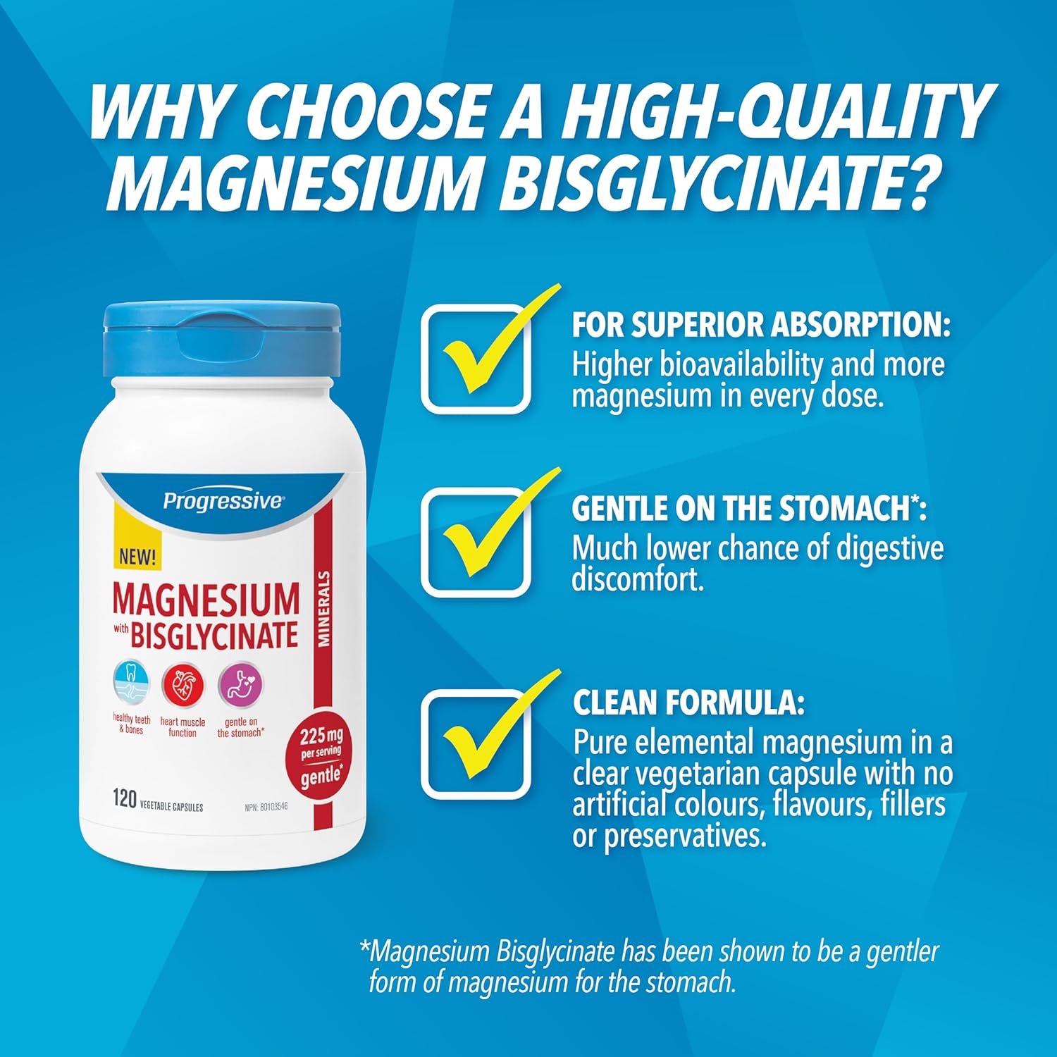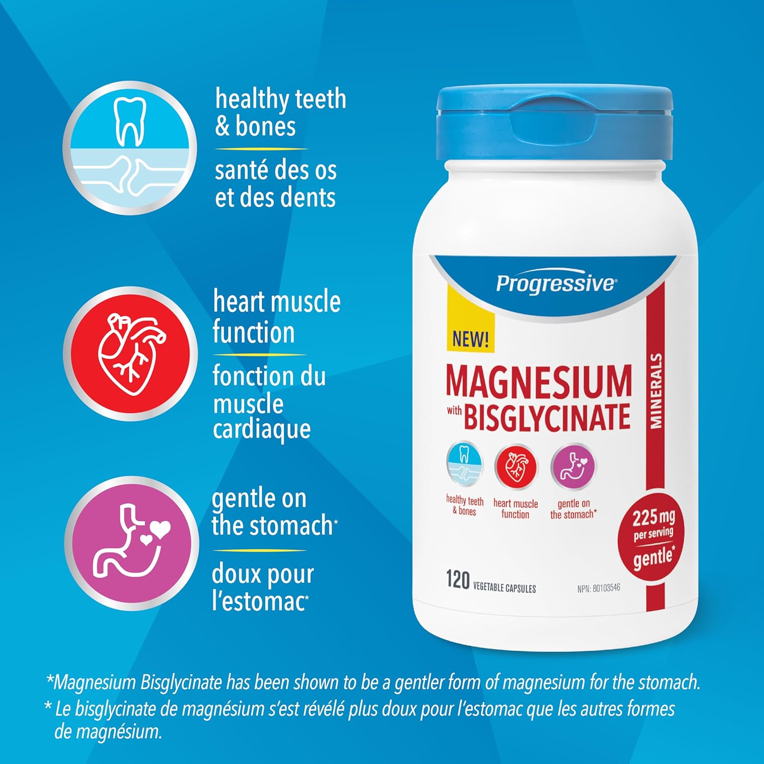 Progressive Elemental 雙甘氨酸鎂 225 毫克 — 120 粒素食膠囊 — 高度可吸收的溫和雙甘氨酸鎂混合物,有助於睡眠、心臟、骨骼和肌肉功能