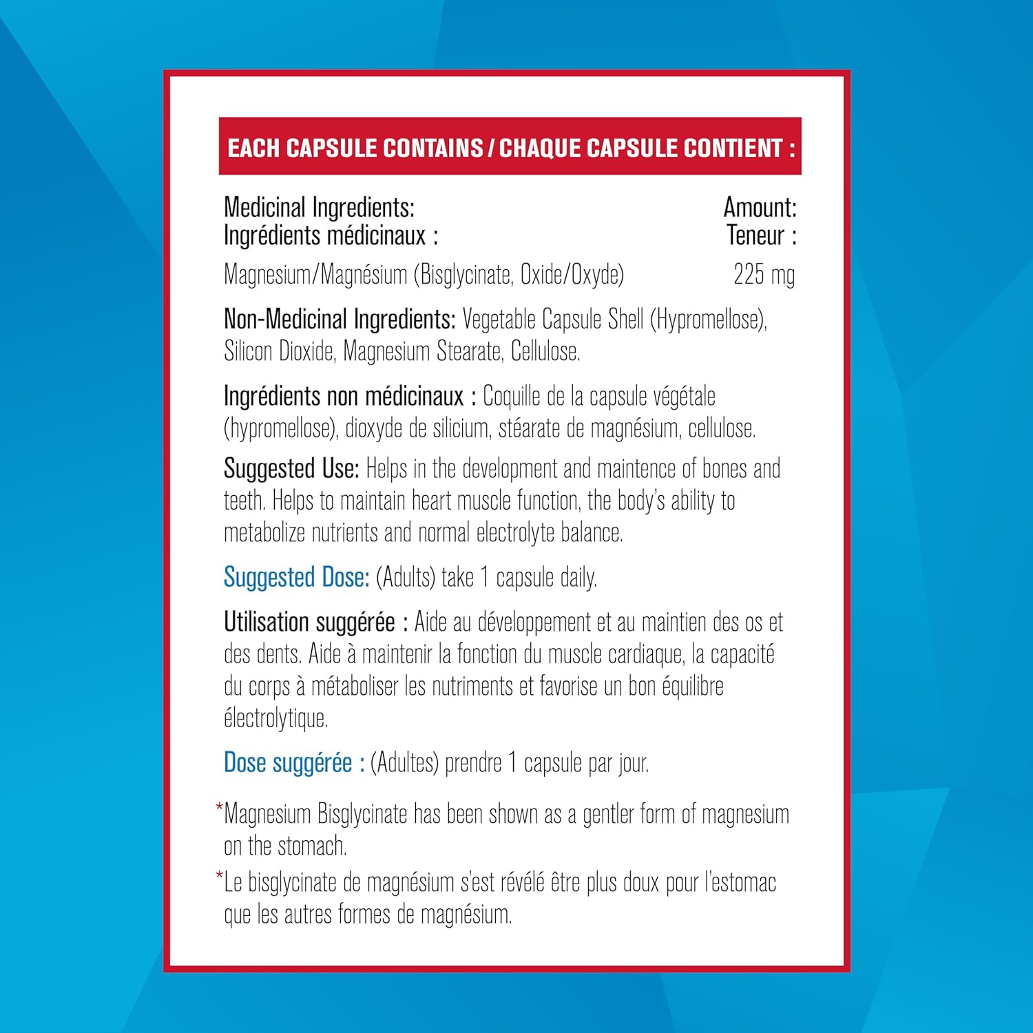 每顆含雙甘胺酸鎂的漸進式鎂膠囊含有225毫克元素鎂。本產品含有易吸收的雙甘胺酸鎂,證實對胃部較溫和。