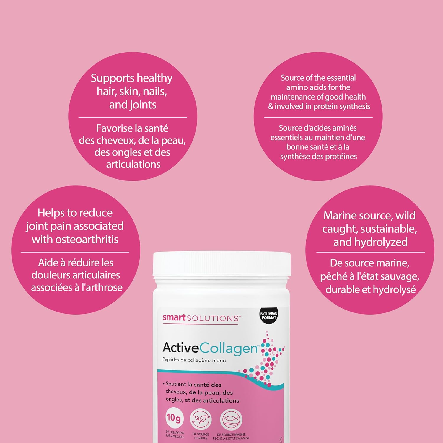 Smart Solutions 活性膠原蛋白是一種清潔且可持續來源的海洋膠原蛋白。膠原蛋白有助於維持健康的皮膚、頭髮、指甲和關節。活性膠原蛋白易於融入您的日常生活。您可以將這種粉末添加到飲料、湯和食物中。活性膠原蛋白不含牛肉、雞肉或豬肉,非常適合節食人士。