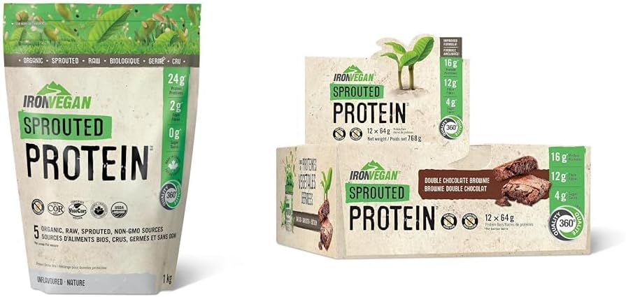 發芽蛋白,無味,1公斤 | 純素、植物基、有機、無麩質、米色和發芽蛋白棒 | 雙倍巧克力布朗尼口味 | 12包