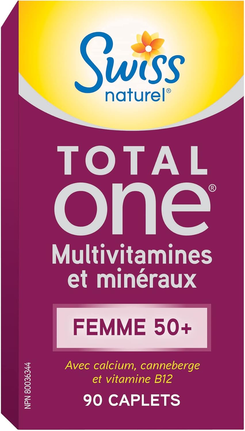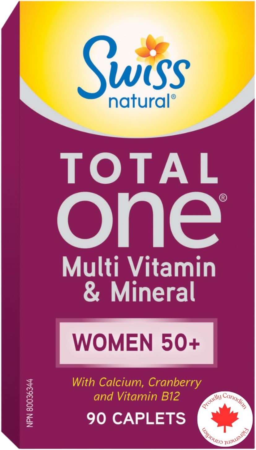 Swiss Natural Total One 女士 50 歲以上複合維生素和礦物質膠囊。專為您量身訂做。富含鈣、蔓越莓、維生素 C 和 D 等成分,可補充您的健康。幫助 50 歲以上女性保持最佳健康狀態。不含人工香料、色素或甜味劑。不含防腐劑、乳製品、麩質、小麥或酵母。