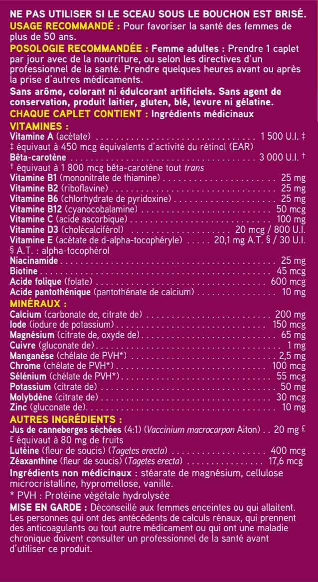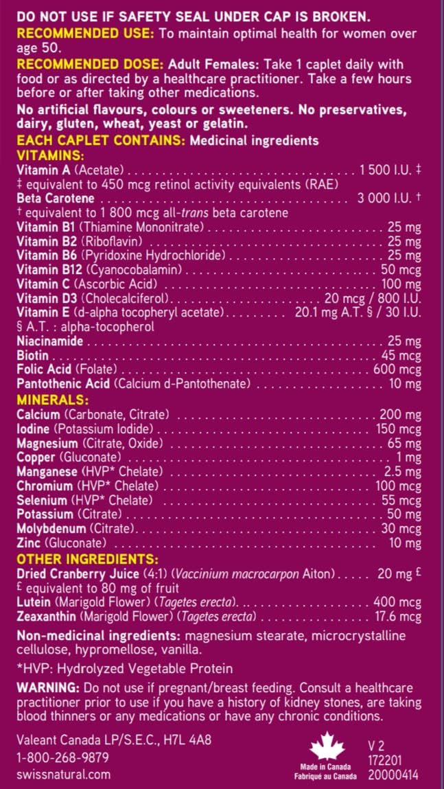瑞士天然全效複合維生素和礦物質 | 50歲以上女性適用,含鈣、蔓越莓和維生素B12,不含鐵 | 日常維護整體健康 | 不含防腐劑或乳製品 | 90粒膠囊