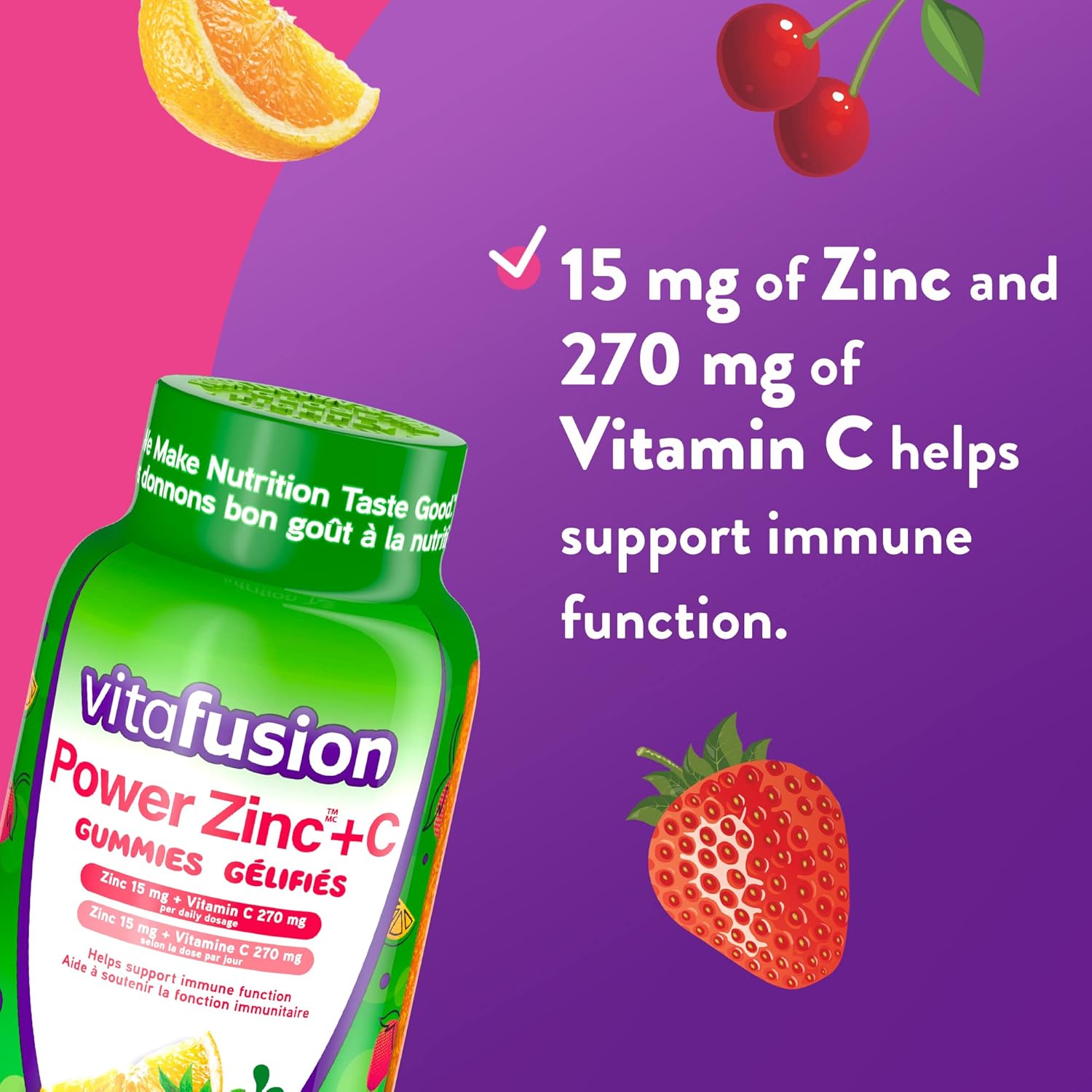 Vitafusion Power 鋅+C 成人維生素軟糖,讓營養美味可口。每份(3 粒軟糖)含有 15 毫克鋅和 270 毫克維生素 C,可增強您的免疫系統。鋅是一種人體必需的礦物質,天然存在於許多食物中,也添加到其他食物中,例如補充劑、感冒藥和一些非處方感冒藥中。這些維生素有助於增強免疫系統,並提高身體代謝營養素的能力。 Vitafusion 軟糖容易咀嚼,無需用水即可服用,更方便。我們易於服用的維生素軟糖採用美味的天然草莓橘子口味,是您補充能量的完美選擇,可幫助您保持愉悅心情,保持最佳健康狀態。我們的軟糖不含人工香料、高果糖玉米糖漿、合成 (FD&C) 色素,也不含麩質和乳製品,為您帶來愉悅的維生素體驗!