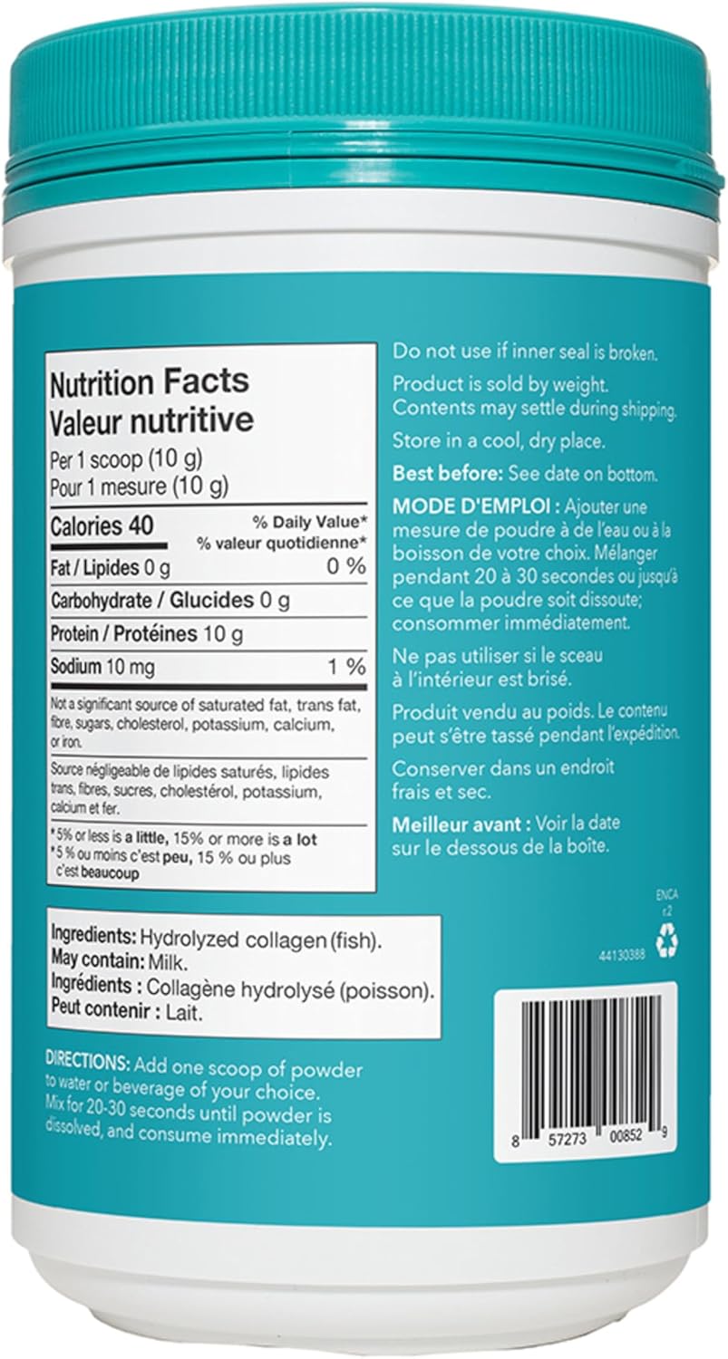 1 Simple Ingredient: VITAL PROTEINS marine collagen peptides powder is made with one simple ingredient, hydrolyzed marine collagen peptides, from the skin of fish sourced off the coast of Alaska (NPN 800865585 ).Helps In The Formation Of Collagen: VITAL PROTEINS helps our bodies form collagen, which supports the structure and elasticity of our connective tissues, tendons, ligaments, and bones.Helps Reduce Joint Pain: This collagen protein powder provides joint support by helping to reduce joint pain associated with osteoarthritis.Source of Amino Acids: VITAL PROTEINS is a source of essential amino acids involved in protein synthesis and the maintenance of good health, including the essential amino acid lysine, which helps in collagen formation; It is also a source of non-essential amino acids that are involved in protein synthesis.Nothing You Don't Want: Now with less plastic in the packaging, VITAL PROTEINS contains no added sugar, no artificial colours, no artificial flavours, and is gluten-free, odourless, unflavoured, non-GMO and paleo-friendly.Easy To Take: Simply dissolve 1.5 tbsp (10 g) of VITAL PROTEINS into water or the beverage of your choice, hot or coldManufacturer: Nestle Canada. Place of Business: Franklin Park, IL 60131. Item model number: Marine Collagen 7.8oz. Product Dimensions: 8 x 4 x 6 cm; 220 g. ASIN: B07W8GX1PD. Best Sellers Rank: #1,128 in Health & Personal Care (See Top 100 in Health & Personal Care)#19 in Collagen Mineral Supplements#40 in Nutrition Bars & Drinks. Date First Available: Aug. 6 2019. Country of origin: Canada. Customer Reviews: 4.4 4.4 out of 5 stars 936 ratings.