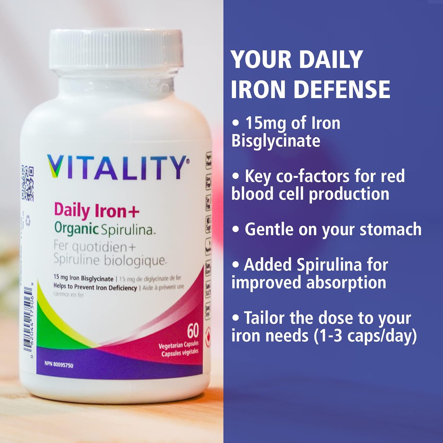 VITALITY 每日鐵+有機螺旋藻配方,滿足您每日所需的鐵質。非常適合搭配 Power Iron + 有機螺旋藻補充劑使用,也適合純素食者/素食者、缺鐵的青少年/老年人、胃腸道高度敏感者或產前補充劑。所有 VITALITY 產品均在加拿大製造,並在 600 多家天然健康產品零售商處有售。