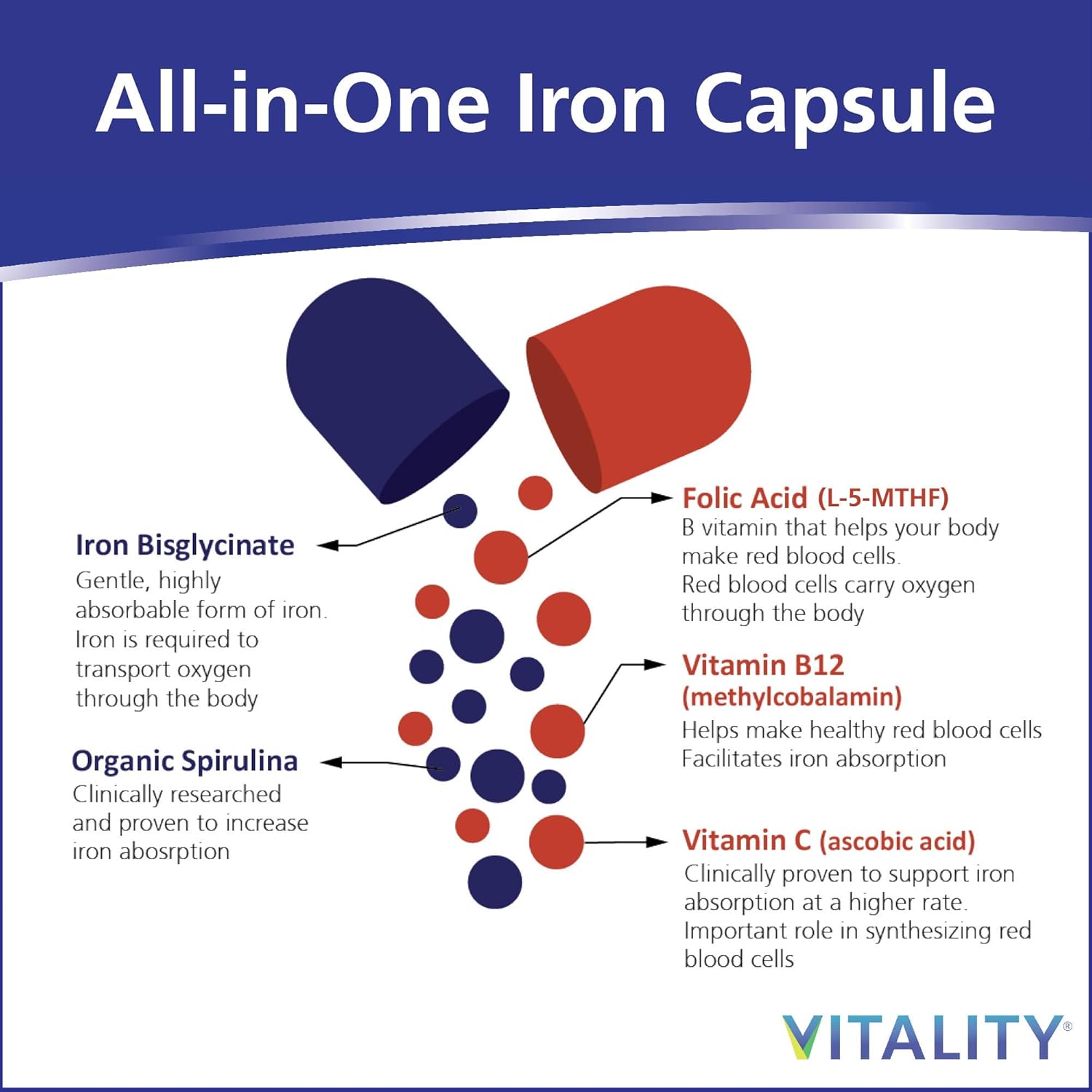 VITALITY 每日鐵補充劑 15 毫克 - 溫和的雙甘氨酸鐵,含 B12 維生素 C、葉酸和葉酸,適合敏感胃的完全造血劑,30 粒素食膠囊