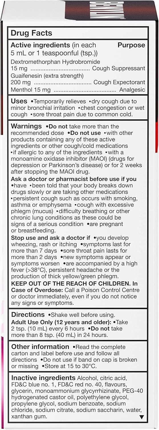 Benylin 強效止咳化痰糖漿,100 毫升,專為胸部設計,有助於清除胸悶,緩解咳嗽。薄荷醇可緩解咽喉痛。快速有效地緩解咳嗽痰多、胸悶和咽喉痛。每 5 毫升或 1 茶匙 (tsp.) 含 15 毫克止咳藥氫溴酸右美沙芬(用於控制乾咳)、200 毫克祛痰藥癒創甘油醚(用於緩解胸悶)和 15 毫克鎮痛藥薄荷醇(用於緩解喉嚨痛)。僅限成人及 12 歲以上兒童使用。使用前請搖勻。每 6 小時使用 2 茶匙 (10 毫升),每日最多使用 8 茶匙 (40 毫升)。 Benylin 必須搖勻。