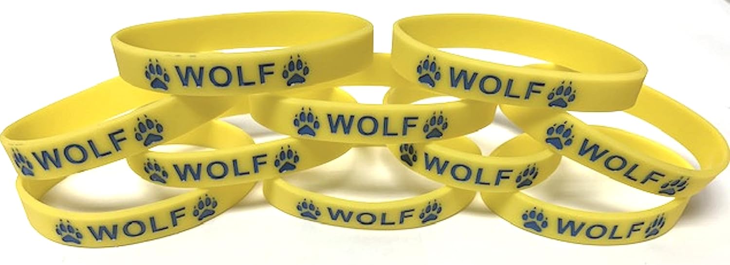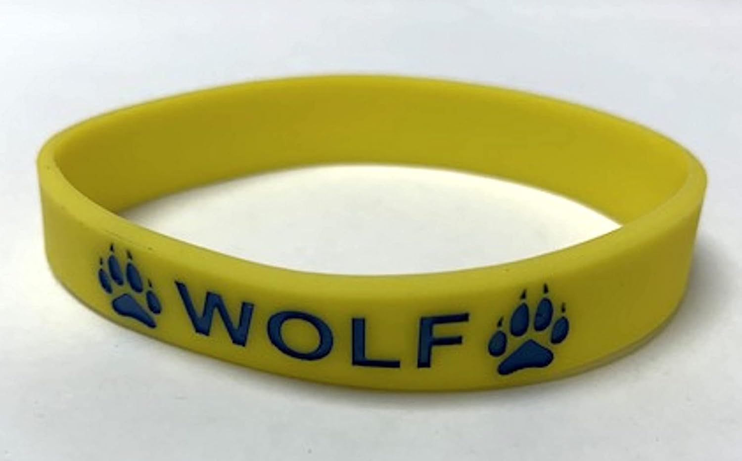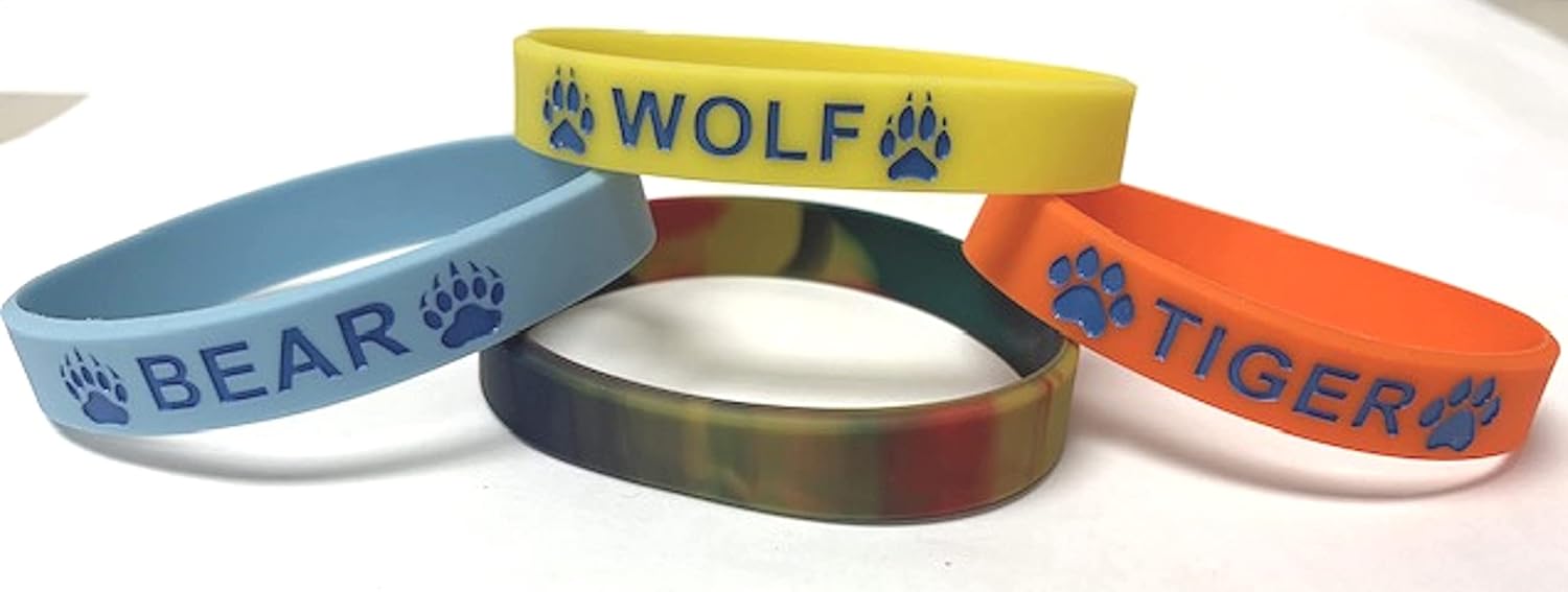 這款黃藍相間的壓花矽膠腕帶印有「狼」字樣和爪印,適合青少年佩戴,週長7英寸,寬1/2英寸。狼級幼童軍佩戴它一定會感到自豪。非常適合團隊建立、慶祝成就、籌款和派對。足夠小隊或小隊隊長分發。同款設計,一包10個。