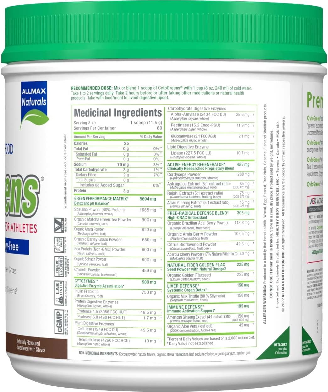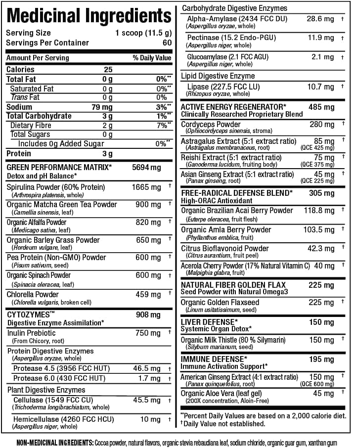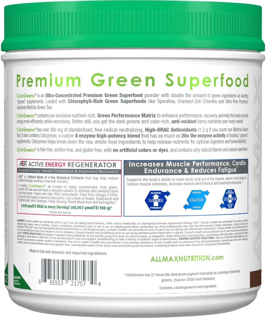 CYTOGREENS 是一種超濃縮優質綠色超級食品粉,其綠色成分含量是領先「綠色」補充劑的兩倍。富含葉綠素的綠色超級食品,如螺旋藻、破細胞小球藻和超細優質日本抹茶。 CYTOGREENS 含有我們獨特的營養豐富的綠色性能矩陣,可提高性能、恢復並幫助身體在運動時更有效地回收能量。更好的是,您可以獲得身體所需的深綠色和顏色豐富的抗氧化漿果營養素! • 注入螺旋藻、菠菜和大麥草• 21 倍深綠色葉菜的綠色營養素‡ • 提高能量水平* CYTOGREENS 擁有超過 1.2 克標準化的自由基中和高 ORAC 抗氧化劑。它還含有 Cytozymes,一種定制的 8 種酶高效混合物,其酶活性是領先「綠色」補充劑的 20 倍。細胞酵素有助於分解天然的全食物成分,從而釋放營養,以達到最佳消化和生物利用度。 CYTOGREENS 不含填充劑、卵磷脂、麩質、非基因改造成分,不含人工色素或染料,僅含天然香料和天然甜味劑。