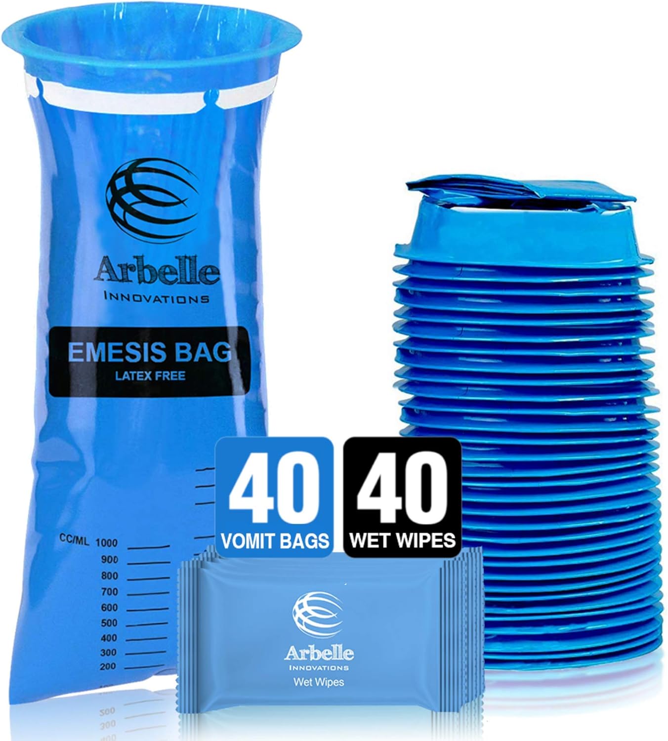 一次性嘔吐袋,嘔吐袋 - 40個嘔吐袋+40片濕紙巾,用於噁心、暈車、汽車、懷孕、化療嘔吐,藍色嘔吐袋,優質防漏,方便旅行