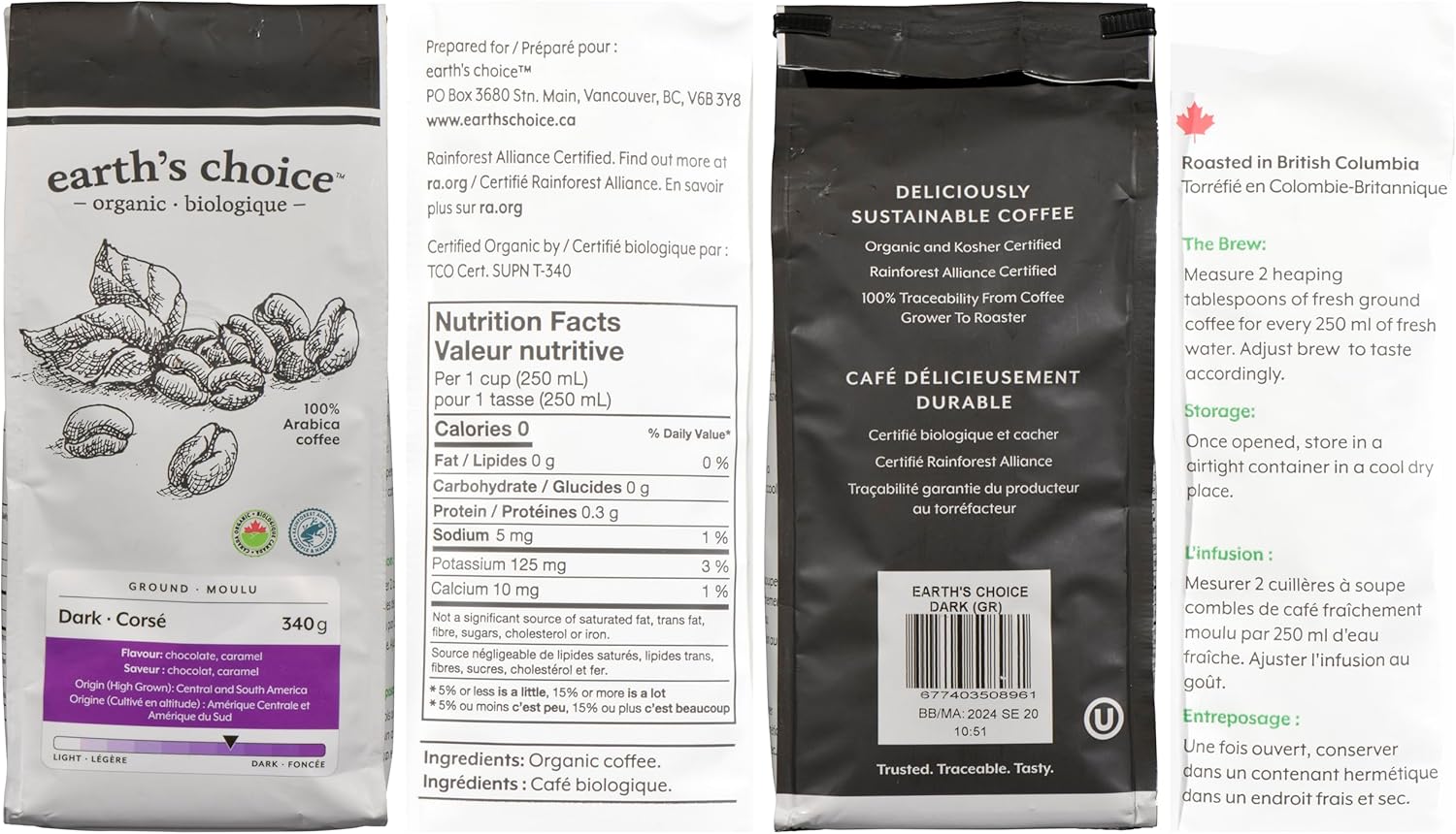 Earth's Choice 有機咖啡,深色研磨,可生物降解包裝,340克