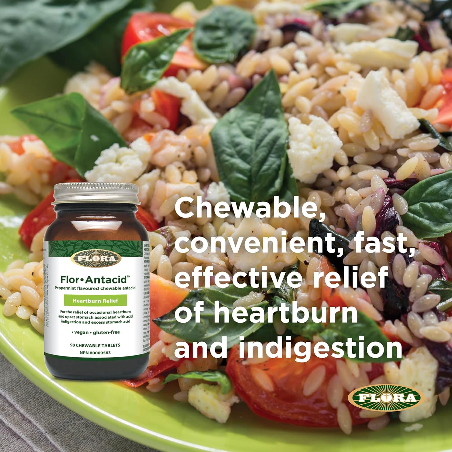 Flora Health Flor-Antacid - 用於緩解偶爾因消化不良和胃酸過多引起的胃灼熱和胃部不適 - 真正的薄荷油口味 - 90 片咀嚼片