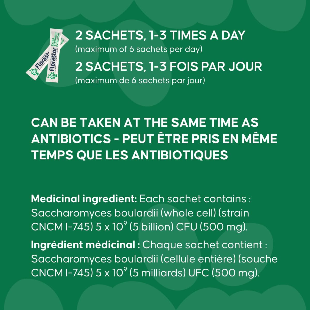 強效腸道支持 - Florastor 的多合一配方,簡化您的日常保健。支持胃腸道健康,增強免疫系統,治療急性腹瀉,預防旅行者腹瀉 (turista) 和抗生素相關性腹瀉。天然抗藥性…降低抗生素相關性腹瀉風險 - 布拉氏酵母菌益生菌經研究顯示對 16 種常見口服抗生素具有抗藥性。臨床研究表明,Florastor 可將兒童抗生素相關性腹瀉風險降低高達 80%,成人降低高達 84%。含乳糖…臨床研究功效 - Florastor 的功效已得到臨床驗證,並擁有超過 65 年的研究和 130 多項臨床試驗的支持。它可將成人抗生素相關性腹瀉的風險降低高達 84%。全球同類益生菌排名第一——Florastor 是值得信賴的益生菌品牌,有助於實現和維持健康的消化平衡。 Florastor 菌株已獲得加拿大消化健康基金會 (CDHF) 的認證。