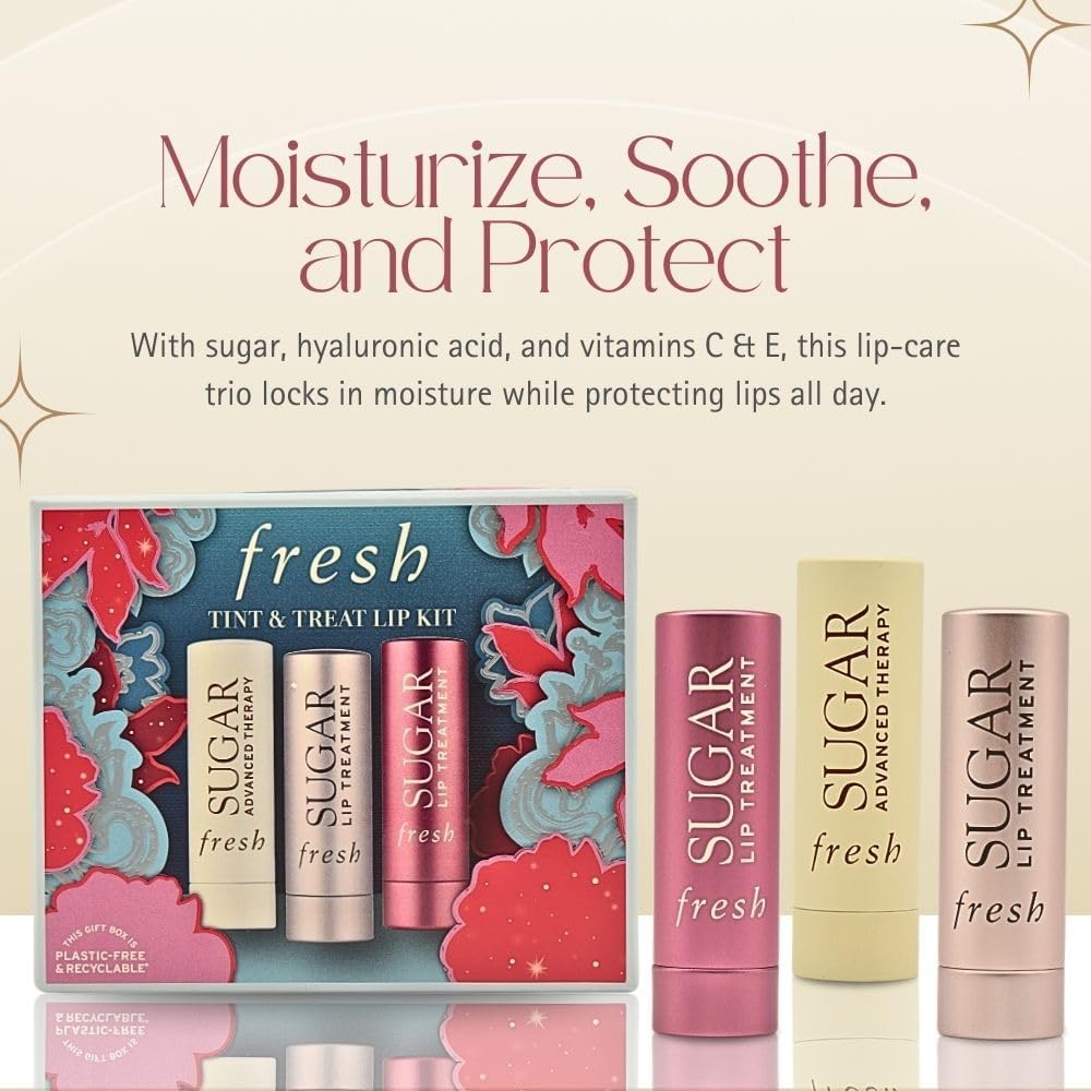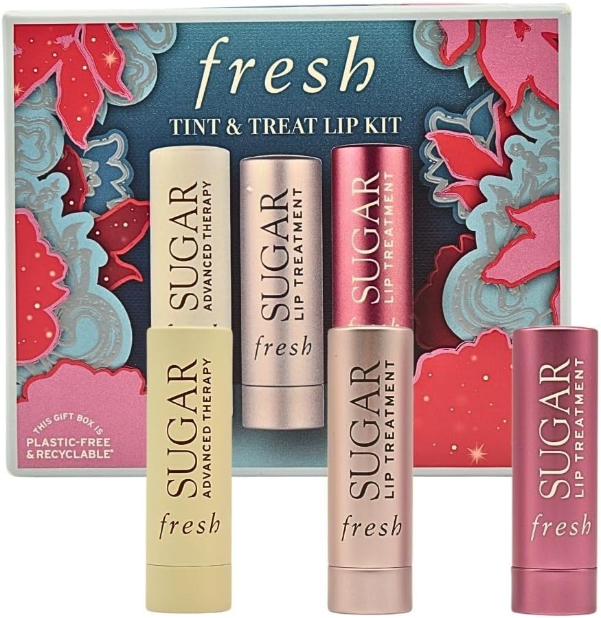Fresh 唇部護理套裝是一款三件套女士唇部護理套裝,包含 0.07 盎司糖霜玫瑰唇膏、0.07 盎司糖霜高級護理霜和 0.07 盎司糖霜綻放唇膏。這款套裝能夠溫和去角質、滋養唇部,並提升唇部質感。
