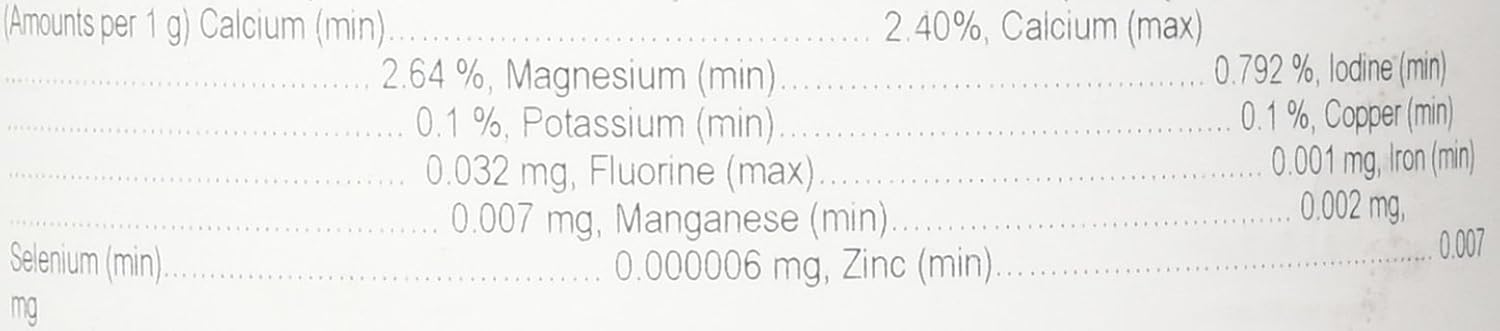 Fresh Trace 提供多種經證實*對魚類健康和生長至關重要的微量元素。與陸生動物不同,魚類從食物和環境中獲取營養。微量元素通常會因利用、氧化和沈澱而消耗殆盡,因此定期補充這些元素至關重要。 Fresh Trace 僅含有經證實*對魚類必需的元素。保證分析(每1克含量)鈣(最小值)…2.40%,鈣(最大值)…2.64%,鎂(最小值)…0.792%,碘(最小值)…0.1%,鉀(最小值)…0.1%,銅(最小值)…0 .032毫克,氟(最大值)…0.001毫克,鐵(最小值)…0.007毫克,錳(最小值)…0.002毫克,硒(最小值)…0.000006毫克,鋅(最小值)…0.007毫克