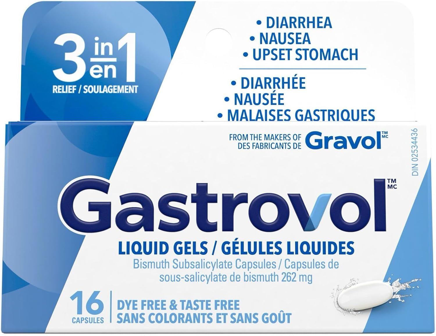 Gastrovol 是您緩解腹瀉、噁心和胃部不適的三合一解決方案。每粒液體膠囊含有 262 毫克次水楊酸鉍 USP,無味、無色素,易於吞嚥。無論您是居家或外出,Gastrovol 都能隨時隨地為您提供便利的消化支持。採用進口和國產零件,在加拿大製造。由加拿大排名第一的噁心緩解品牌 Gravol 的製造商生產。 * *資料存檔於 2025 年