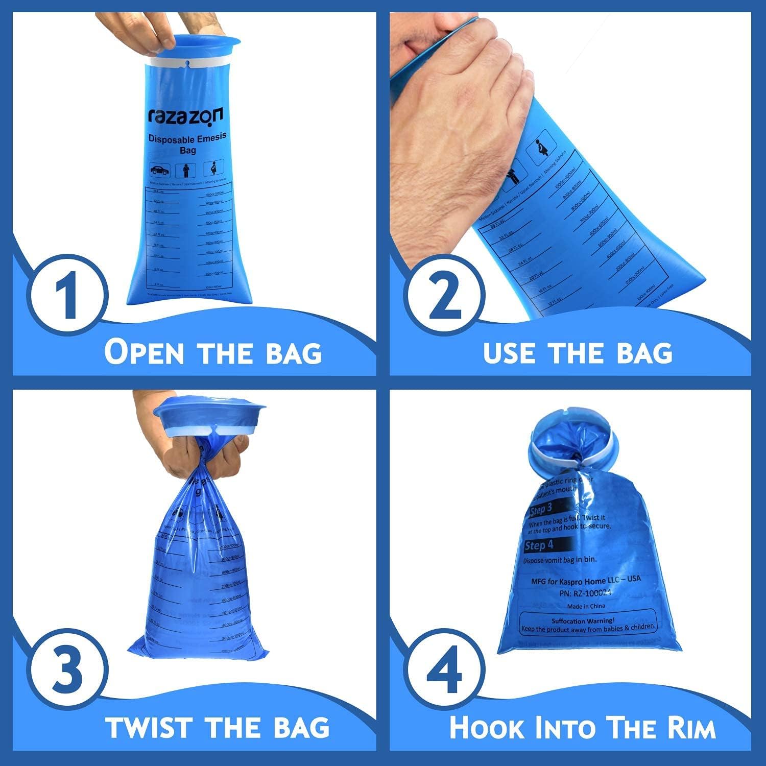 RAZAZON嘔吐袋為藍色。它們更厚、更深,由堅固的塑膠製成,容量更大。堅固耐用,密封性好,讓您在旅行時遠離尷尬的嘔吐。可放入汽車、計程車、公車座椅靠背、手套箱、錢包和書包等任何地方。登機、輪船時也可放在包包裡。在醫院、船和火車等場所,兒童可以使用這些一次性嘔吐袋。孕婦應隨身攜帶,防止弄髒。將嘔吐袋放在化療、孕吐和週期性嘔吐症候群患者的床頭櫃上,以備不時之需,保持周圍環境安全清潔。產品詳情:醫用級嘔吐袋,24個裝,耐用、耐用、防漏,小巧便攜,是暈機、暈船和暈車的最佳選擇,材質:藍色低密度聚乙烯,容量:1000毫升。