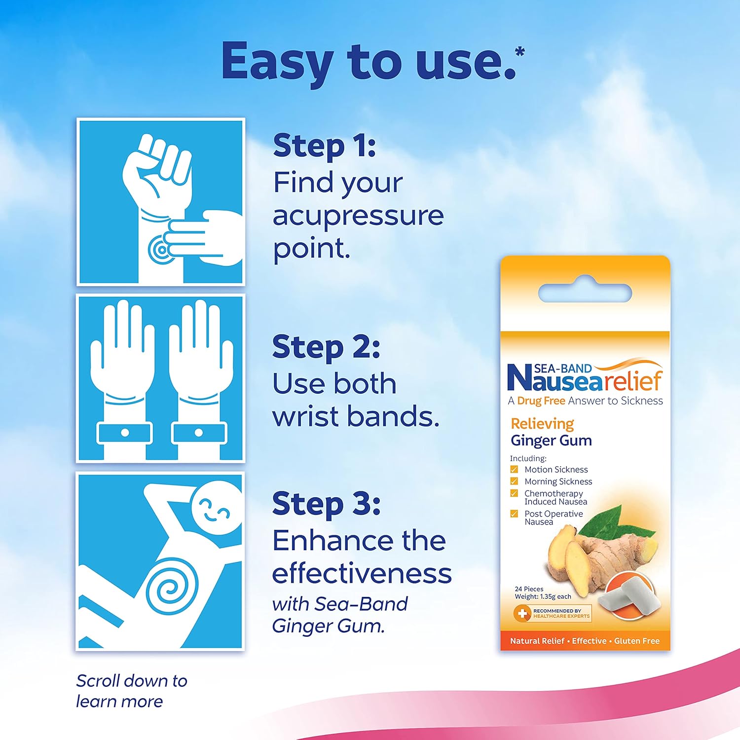 Sea-Band Mama! 專為舒緩和鎮靜孕期腹部而設計,讓您可以重新享受孕期的美好時光。 Sea-Band 採用指壓按摩技術,可與我們的生薑薄荷精油滾珠或葉酸生薑潤喉糖搭配使用。 Sea-Band 是一種非藥物療法,可有效緩解大多數類型的噁心。 Sea-Band 採用純天然指壓按摩腕帶,溫和地恢復身體平衡。不含藥物,無副作用,經臨床測試,適用於大多數類型的噁心。 Sea-Band 是一款針織彈性腕帶,其工作原理是腕帶內側的塑膠旋鈕施加壓力並刺激 P6(內關穴)。研究表明,按壓該穴位可緩解噁心和嘔吐。 Sea-Band 可立即起效,可在您感到噁心時佩戴。本產品可連續使用,並可重複使用。 Sea-Bands 適合 3 歲及以上兒童使用,有多種顏色可供選擇。