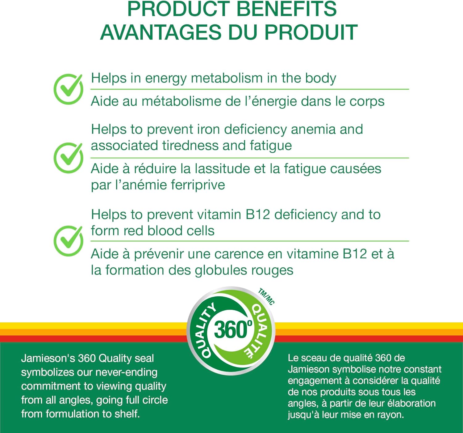 Jamieson Iron plus Vitamin B12 是一款天然能量咀嚼片,每片含 18 毫克元素鐵和 1,000 微克維生素 B12。鐵是一種重要的礦物質,有助於緩解缺鐵引起的疲勞。維生素 B12 是一種天然能量維生素,有助於支持營養素代謝和自然能量。本補充劑中的維生素 B12 源自於甲鈷胺,這是一種先進的維生素 B12 來源,有助於加快吸收。