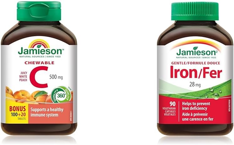 Jamieson 咀嚼維生素 C 500 毫克 - 白桃口味,120 粒(1 包)和溫和鐵 28 毫克雙甘氨酸亞鐵 - 無麩質,90 粒(1 包)