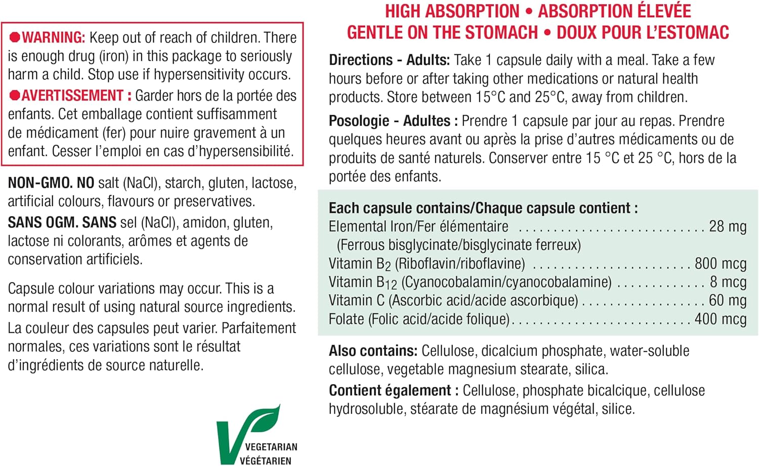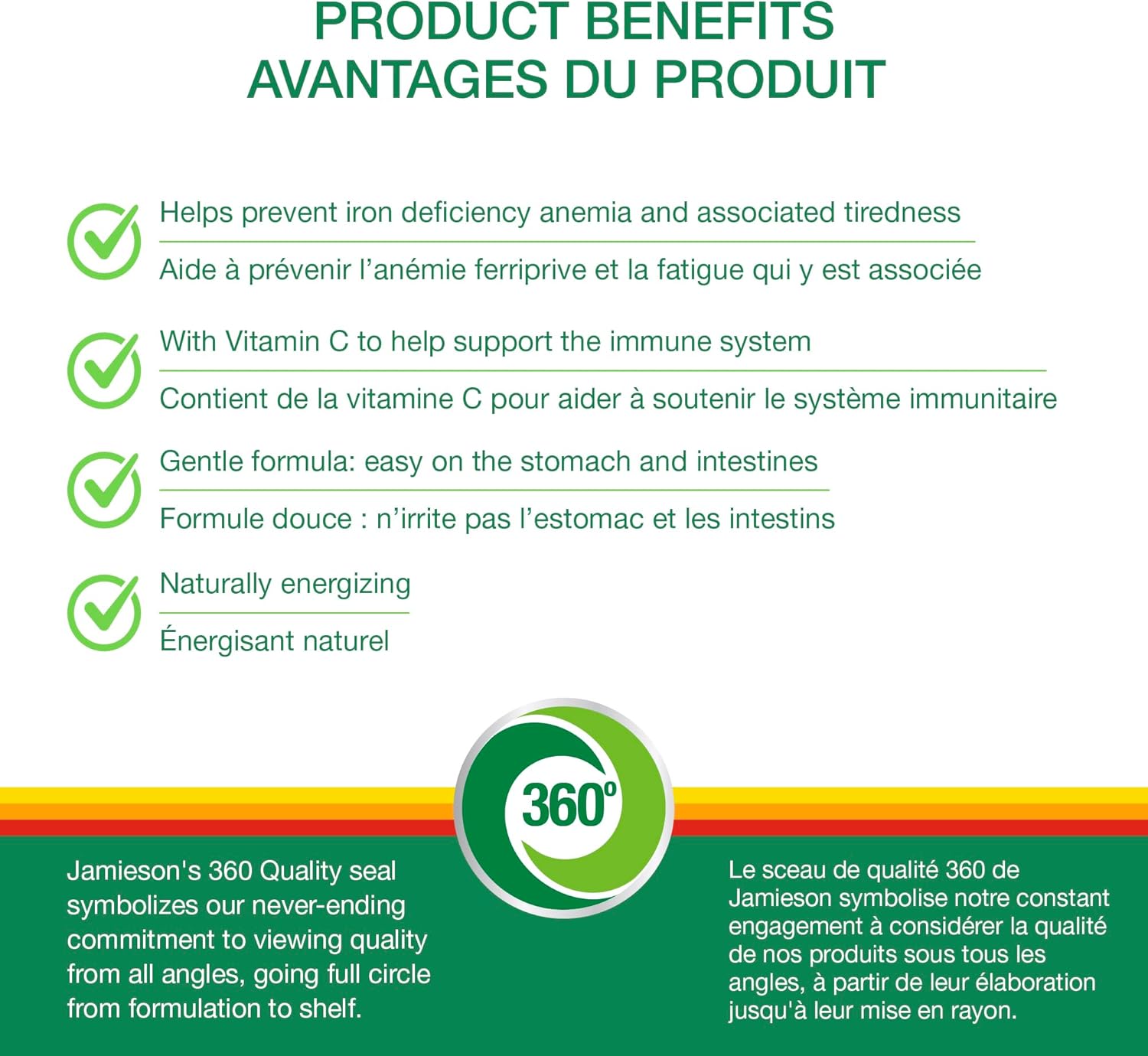 Jamieson 鐵劑 28 毫克,添加葉酸、維生素 B2、維生素 B12 和維生素 C,有助於預防缺鐵,促進吸收,溫和呵護腸胃。非基因改造,無麩質,150 粒素食膠囊