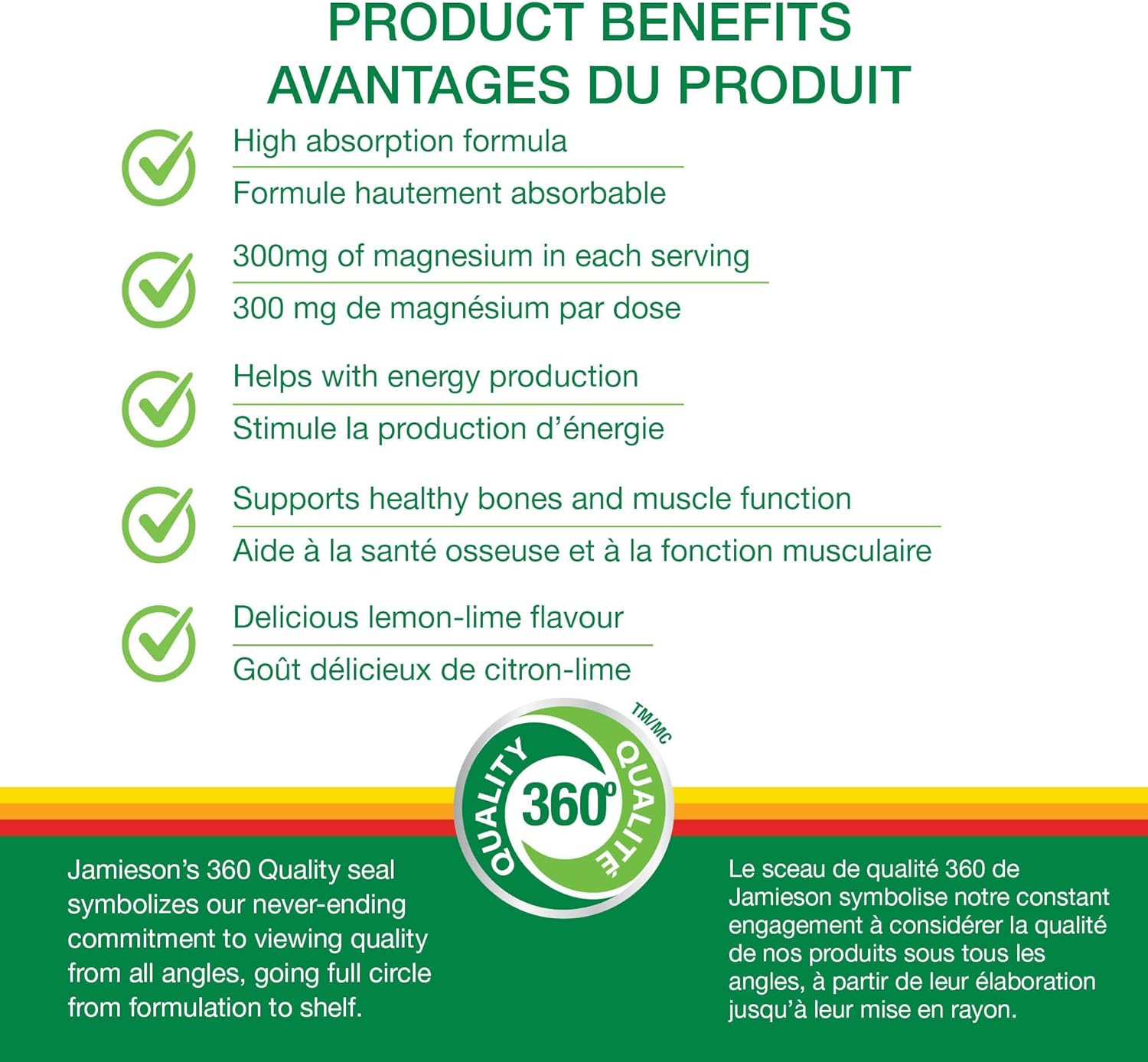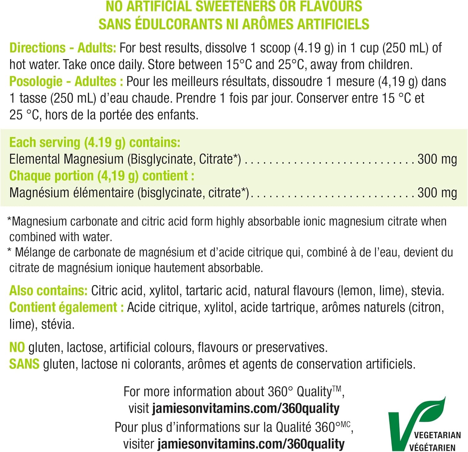 Jamieson 強效甘胺酸鎂 300 毫克粉末,天然檸檬青檸口味,支持肌肉功能、骨骼健康,提升能量。無麩質,不含人工色素、香精或防腐劑,228 克
