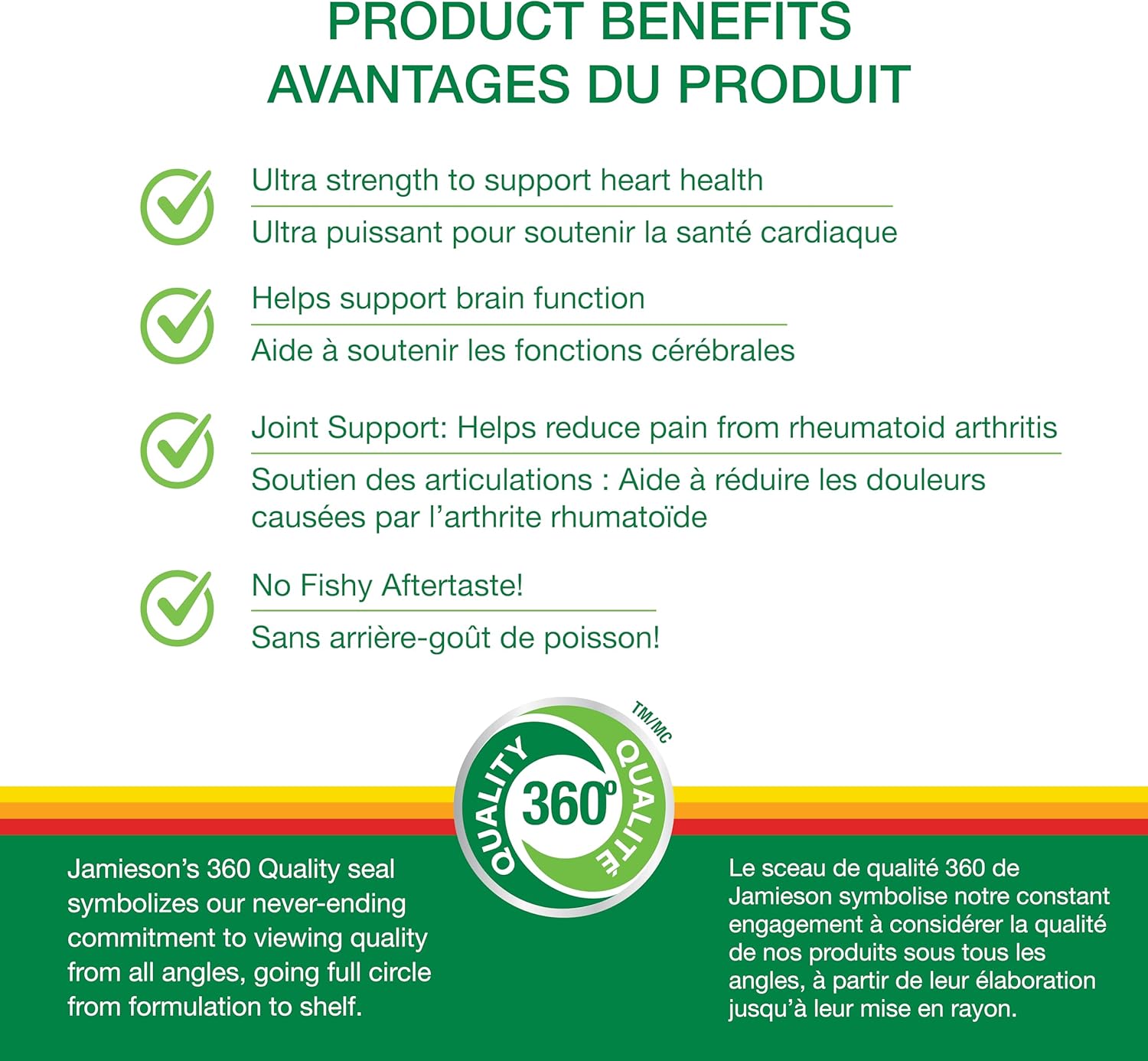 Jamieson 無魚腥味 Omega-3 700 毫克是一款超強效 Omega-3 魚油補充劑。 Omega-3 魚油有助於促進心臟健康並降低膽固醇。此外,這款補充劑的配方不含魚腥味或引起打嗝的副作用。本產品經藥物測試,保證不含汞和鉛等重金屬。