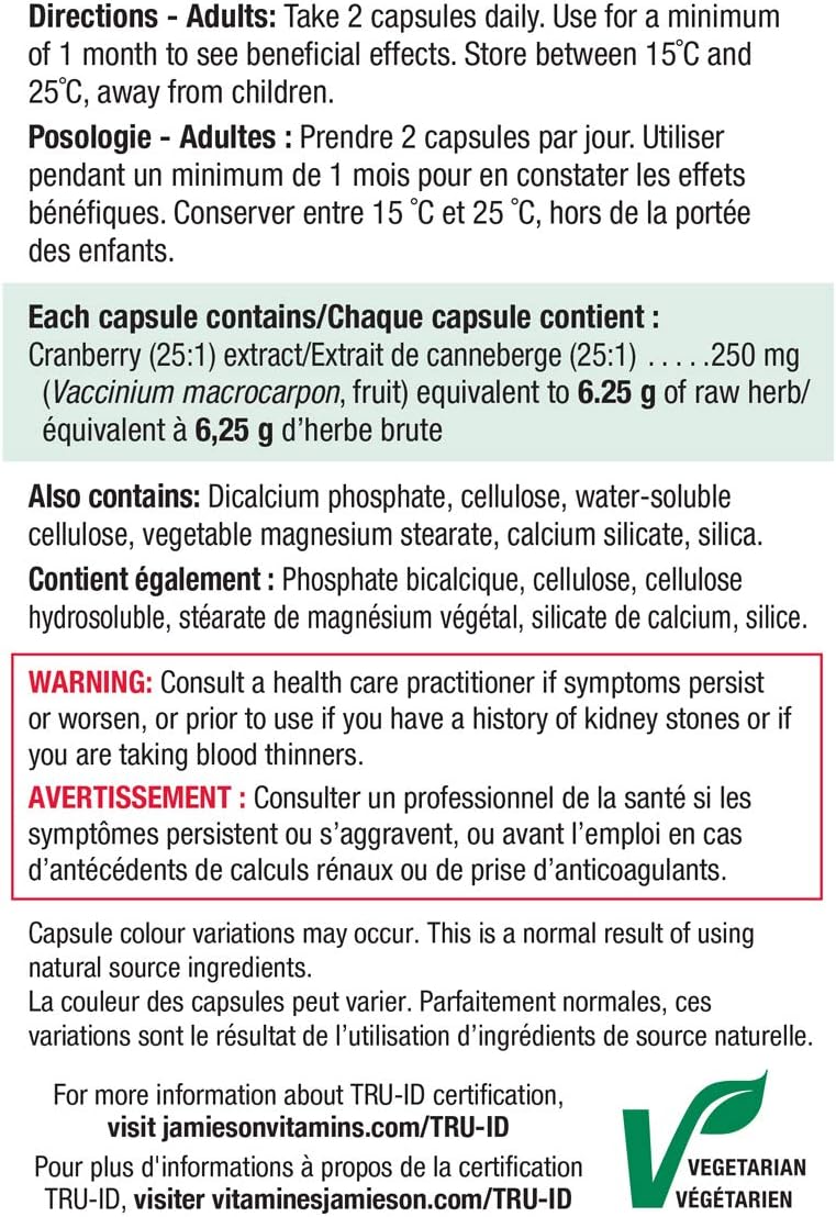 Jamieson 女性益生菌複合物 70 億,45 粒素食膠囊。 Jamieson 女性益生菌複合物每粒素食膠囊可提供 70 億菌落形成單位 (CFU)。這款益生菌專為支持女性腸道、消化系統和陰道健康而配製。這些益生菌膠囊採用先進的軟管包裝技術,防潮,確保有效期至有效期限。蔓越莓複合物 250 毫克 - 素食,無麩質,100 粒(1 包)Jamieson 蔓越莓 250 毫克含有濃縮的純蔓越莓汁,這是一種預防泌尿道感染的傳統方法。