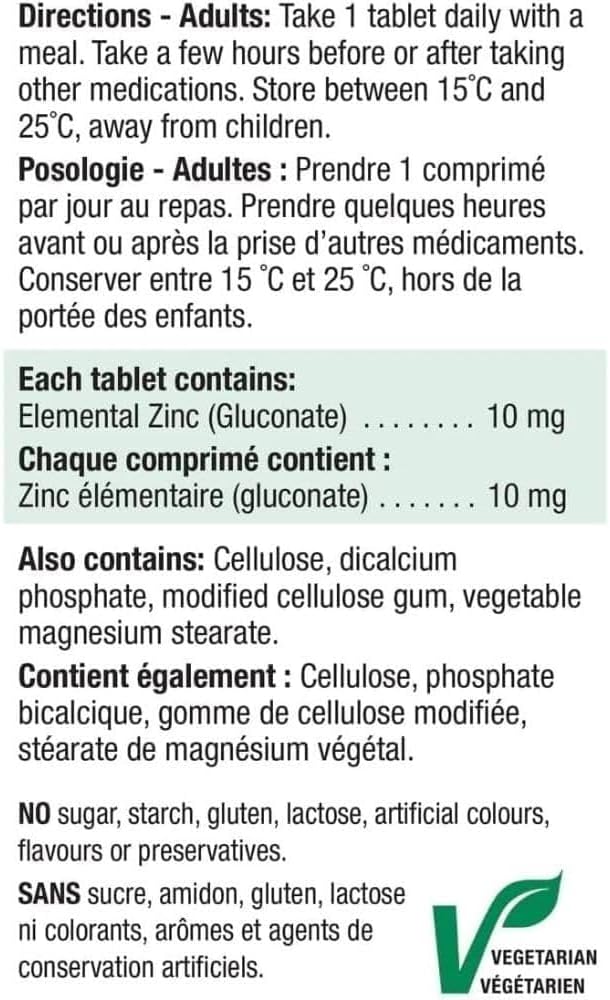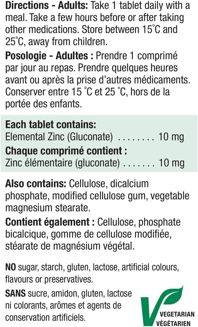Jamieson 鋅 10 毫克,支持免疫健康、組織形成和皮膚健康。素食、非基因改造、無麩質,100 片裝,加拿大製造