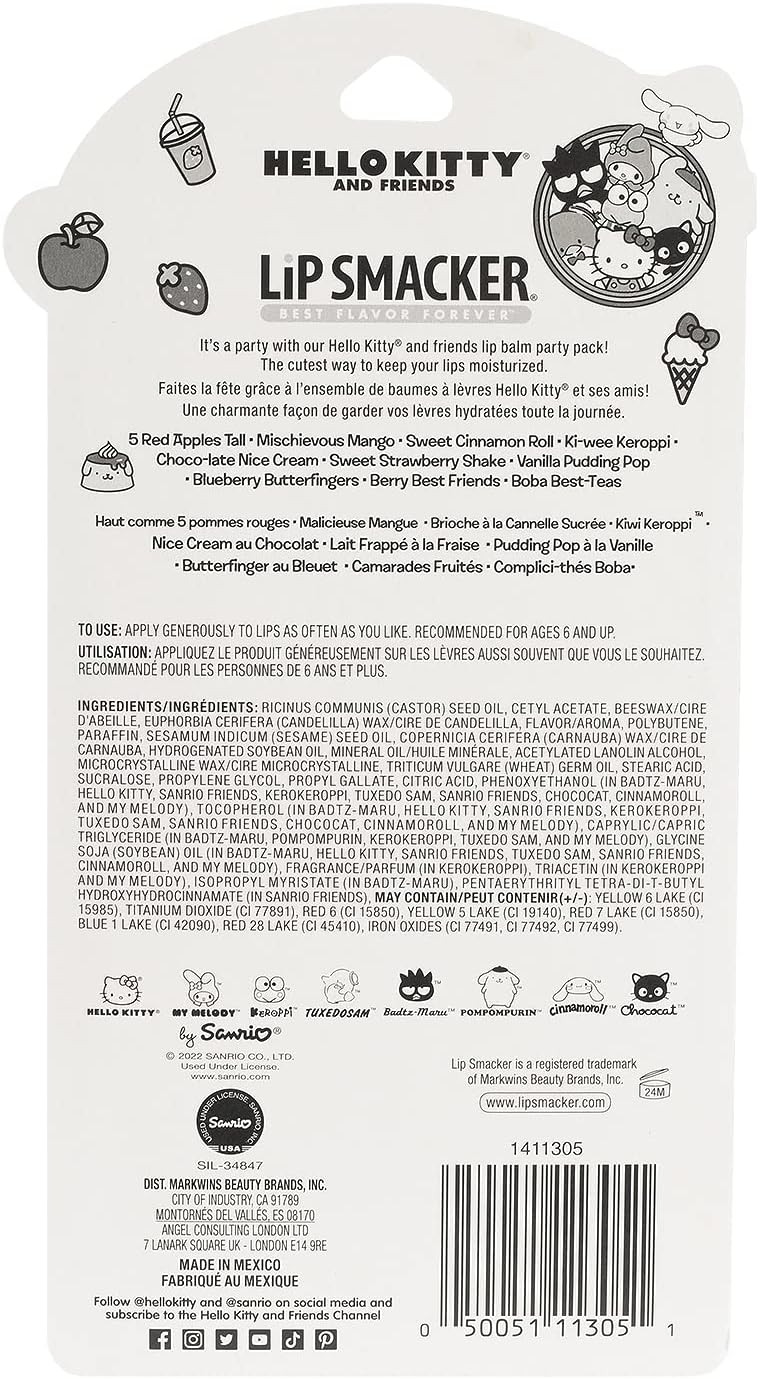 Lip Smacker Sanrio Hello Kitty 和朋友 10 片口味潤唇膏派對裝,透明啞光,適合兒童、男士、女士、乾燥嘴唇、My Melody、Little Twin Stars 和 Chococat