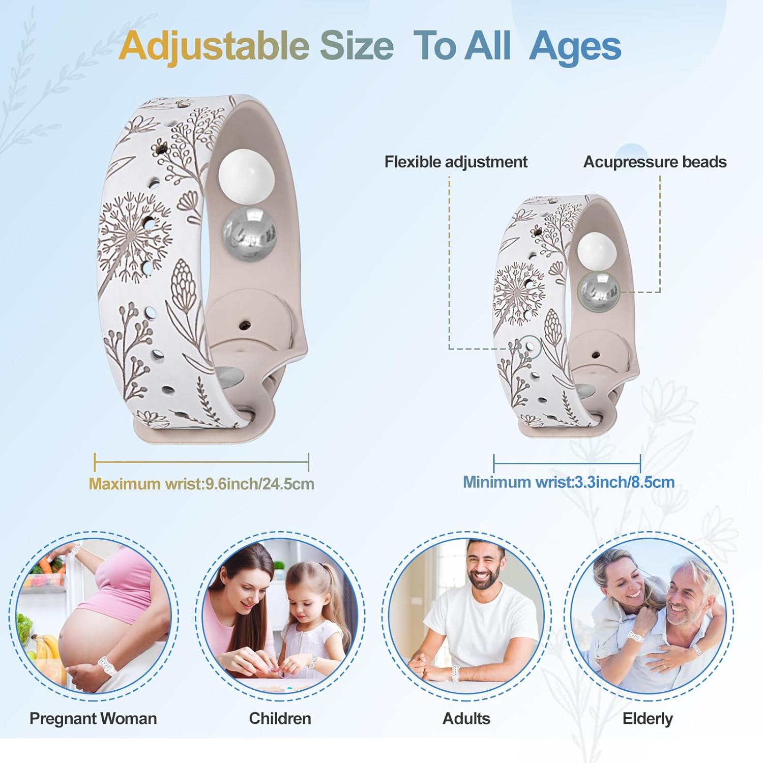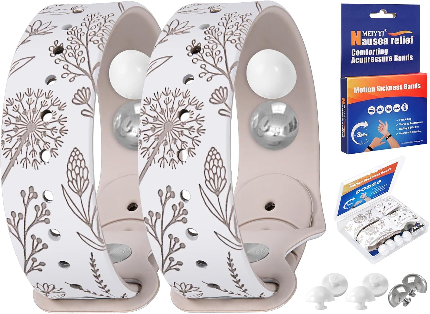 【最新雙色設計】暈車腕帶採用先進的雷射雕刻技術製作出清晰生動的花朵圖案,採用最新的雙色設計,使蒲公英印花雕刻更清晰、更立體、更美觀,具有醒目的視覺效果。獨特而時尚的設計一定會為您的日常裝扮增添一絲優雅,無論是功能性還是佩戴性都是非常好的選擇。暈船手環採用食品級矽膠材質製成,柔軟舒適,配戴輕巧親膚。 【無副作用且可攜帶的藥物】防噁心腕帶採用中醫指壓原理,指壓是一種安全溫和的替代療法,用於緩解許多常見疾病的症狀。指壓帶透過刺激手腕上的四個不同壓力點(H7 / P7 / LU9 / P6)。 (有關壓力點位置,請參閱產品說明手冊。)配有收納盒,非常適合攜帶。 【暈車手環】暈船腕帶可自然緩解暈機、暈車、暈船、孕吐、化療、術後引起的噁心感。此外,當指壓珠刺激手腕內部的關鍵壓力點時,有助於減少 VR 的常見副作用,如噁心、頭暈或頭痛。指壓腕帶是自然減少或完全緩解暈動病、孕吐、失眠、壓力、頭痛、噁心和心悸的有效解決方案。 【超值裝】:暈船腕帶收納盒包含:1 對暈車帶,附 6 個指壓珠(4 個白色矽膠指壓珠和 2 個不鏽鋼指壓珠)+程序規範。兩種壓力豆可以交替使用以緩解不同的症狀。不銹鋼指壓珠讓暈車帶變得更重要。 【為什麼選擇 MEIYYJ 手環】:我們專注於各種款式和類型的暈車帶。簡單有效,解決各類人群的暈車症狀,且無副作用。我們希望打造更多更好的產品,滿足未來客戶的需求。如有任何售前和售後問題,請隨時提出您的寶貴意見,這將成為我們進步的方向。