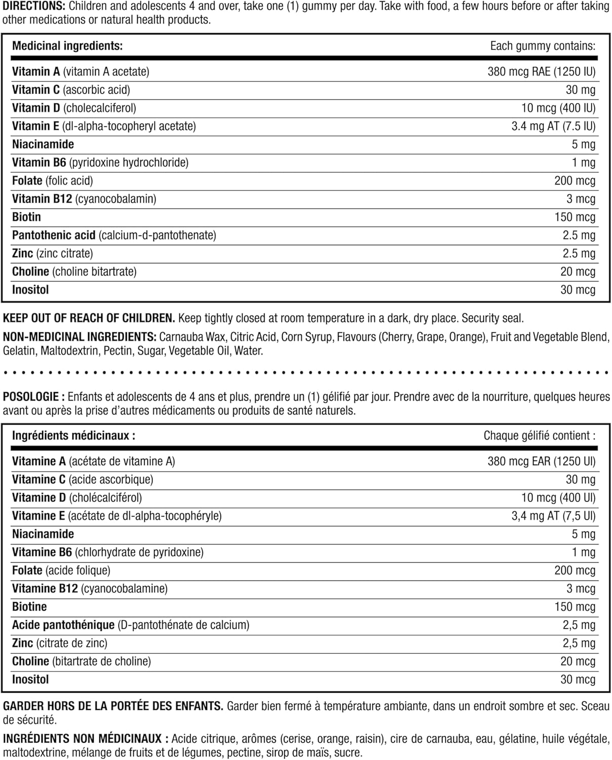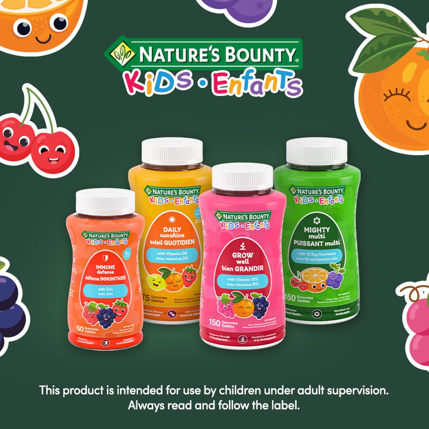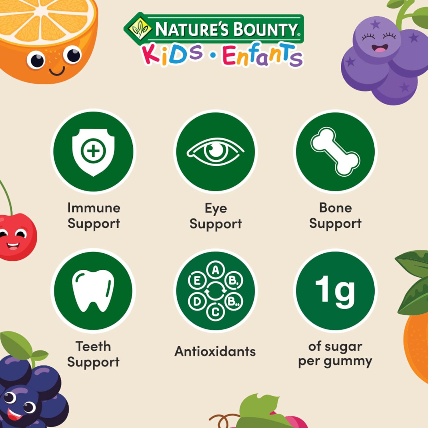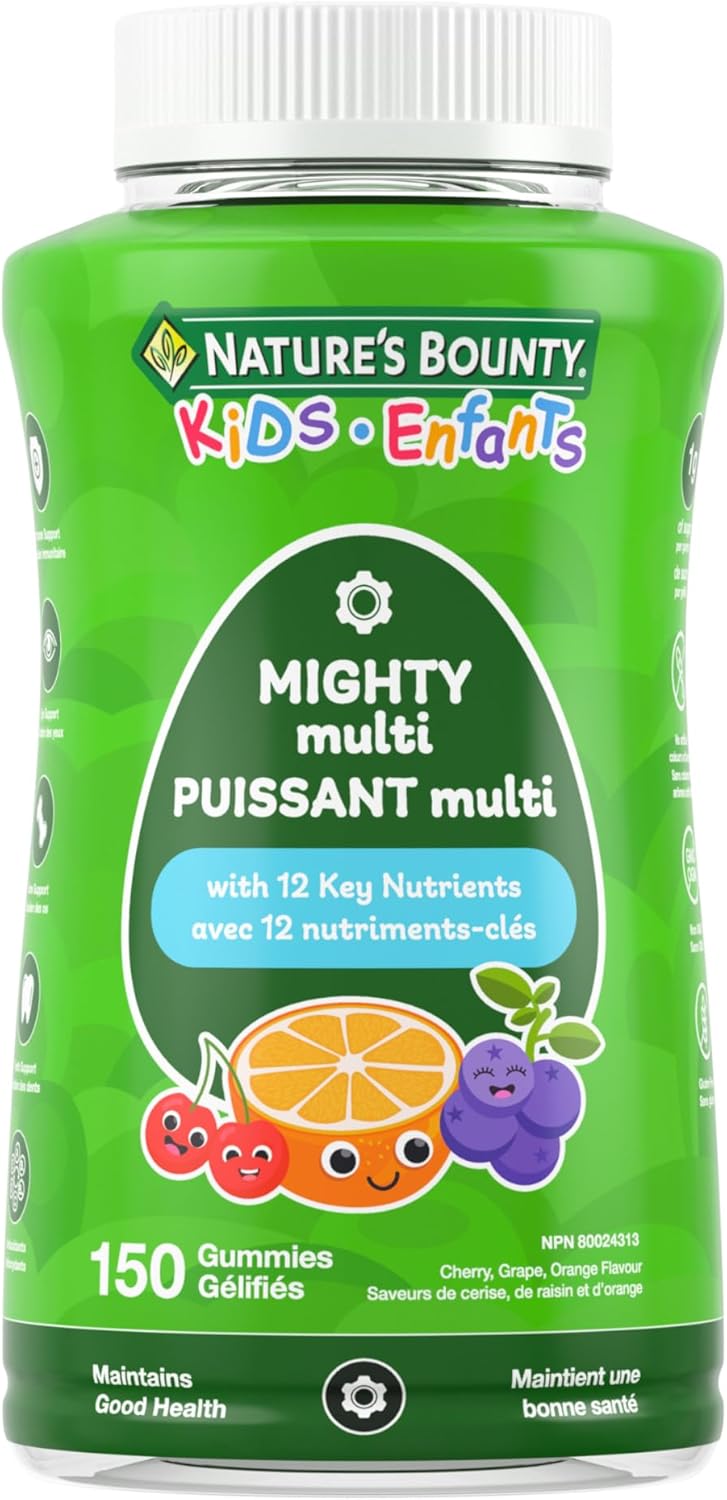40 多年來,NATURE'S BOUNTY 一直以您為中心,研發維生素和營養補充品。您服用維生素是因為想幫助身體保持最佳狀態——那麼,何必糾結於其他維生素品牌呢?今天就來試試 NATURE'S BOUNTY 吧! NATURE'S BOUNTY 兒童多功能軟糖有助於維持身體健康。它富含 12 種關鍵營養素,有助於增強免疫功能和眼部健康,並照顧牙齒和骨骼。這些軟糖富含抗氧化劑,每粒僅含 1 克糖,不含麩質、非基因改造成分,不含人工色素或香精,共有櫻桃味、葡萄味和橙味三種美味口味可供選擇。 4 歲以上兒童及青少年,每日服用一 (1) 粒軟糖。請與食物同服,並在服用其他藥物或天然保健品前或後幾小時服用。