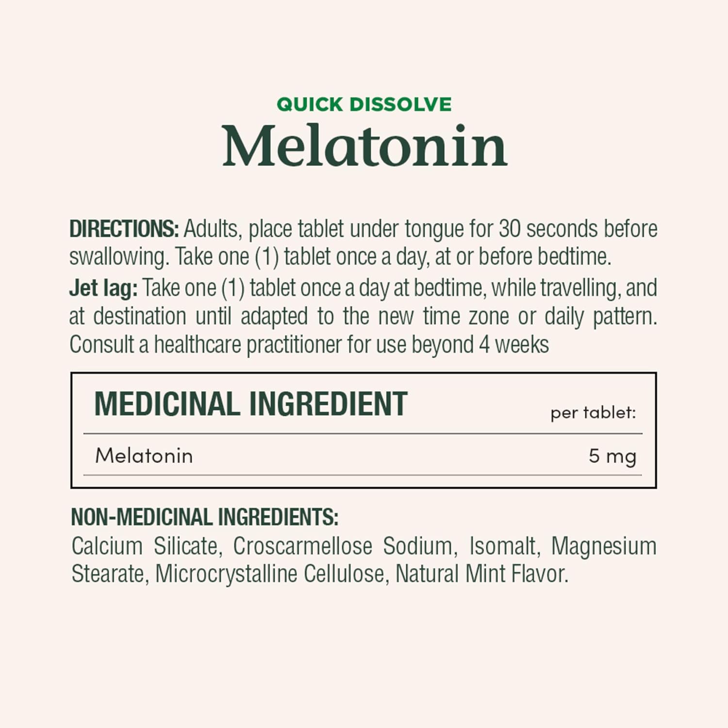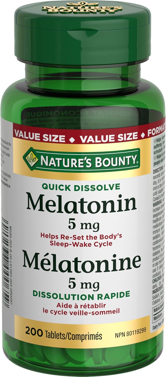 40 多年來,NATURE'S BOUNTY 一直以您為中心,開發維生素和營養補充品。您服用維生素是因為您想幫助身體保持最佳狀態——那麼,何必只選擇普通的維生素品牌呢?今天就試試 NATURE'S BOUNTY 吧。褪黑激素有助於重置身體的睡眠-覺醒週期。 NATURE'S BOUNTY 速溶褪黑激素 5 毫克有助於增加睡眠不足或睡眠時間改變的人(例如患有時差的人)的總睡眠時間。它還有助於減少入睡困難者的入睡時間。這些藥片含有 5 毫克褪黑激素以及矽酸鈣、交聯羧甲基纖維素鈉、異麥芽酮糖醇、硬脂酸鎂、微晶纖維素和天然薄荷香精。成人將藥片放在舌下 30 秒後吞服。每日一次,睡前或睡前服用一 (1) 片。時差反應:每天睡前、旅行期間和到達目的地時服用一 (1) 片,直到適應新的時區或日常模式。