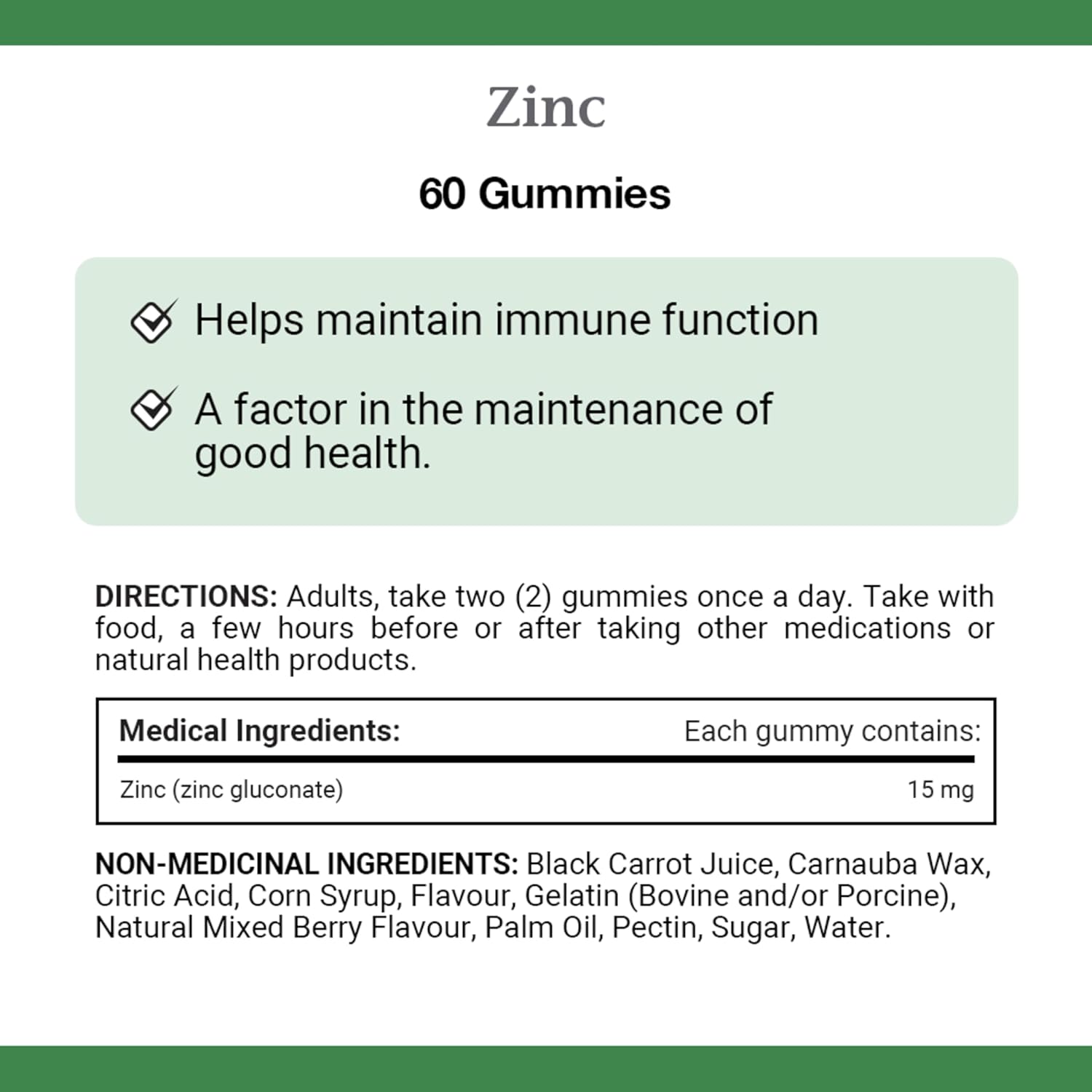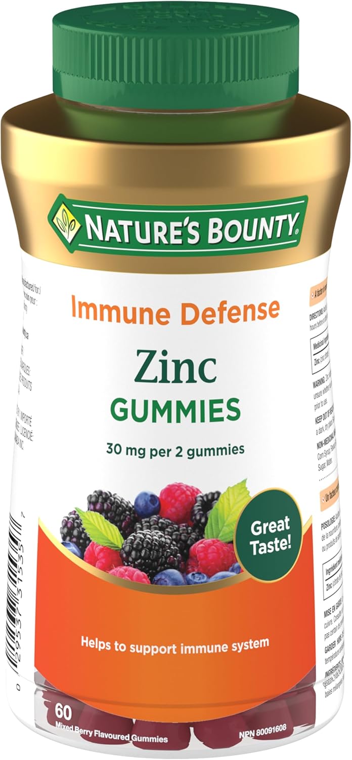 40多年來,NATURE'S BOUNTY 一直以您為中心,研發維生素和營養補充品。您服用維生素是為了幫助身體保持最佳狀態——那麼,何必糾結於其他維生素品牌呢?今天就來試試 NATURE'S BOUNTY 吧!葡萄糖酸鋅有助於維持免疫功能,是維持身體健康的關鍵因素。 NATURE'S BOUNTY 鋅軟糖每粒含 15 毫克葡萄糖酸鋅。這款天然混合莓果味補充劑還含有黑胡蘿蔔汁、巴西棕櫚蠟、檸檬酸、玉米糖漿、香精、明膠(牛明膠和/或豬明膠)、天然混合莓果香精、棕櫚油、果膠、糖和水。成人每日一次,每次兩 (2) 粒。與食物同服,建議在服用其他藥物或天然保健品前或後幾小時服用。