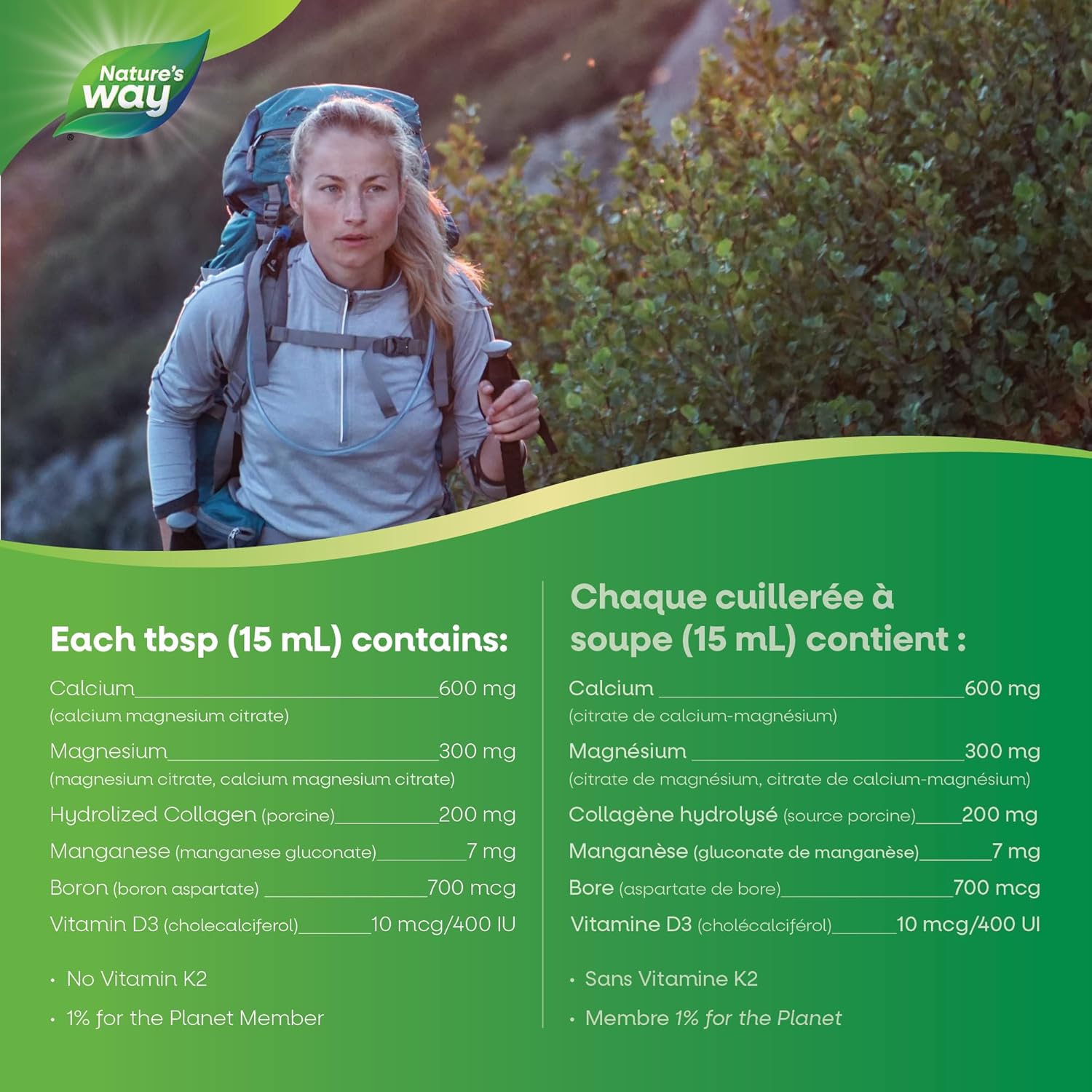NATURE'S WAY 鈣鎂檸檬酸鹽 2:1:Nature's Way 鈣鎂是一種味道極佳的液體補充劑,有助於支持骨骼和牙齒的發育和維護,維持肌肉功能和組織形成。作為健康飲食的一部分,終生攝取足夠的鈣和維生素 D 有助於預防骨質流失和骨質疏鬆症。我們的優質混合物含有維生素 D3,它與鈣和鎂協同作用,幫助支持身體對它們的吸收和利用,同時還具有支持免疫系統的額外益處。以 2:1 的比例配製,每份橙味骨骼補充劑可提供 600 毫克檸檬酸鈣和 300 毫克檸檬酸鎂,另外還含有 200 毫克水解膠原蛋白,以及錳、硼、維生素 K2 和維生素 D3。它是一種方便易吞的液體,成年男性和女性每日一次,每次1湯匙(15毫升),隨餐服用,可在服用其他補充劑或藥物前或後幾小時服用。 Nature's Way 的複合維生素、礦物質補充劑、益生菌和草本配方,旨在簡化您的健康生活。我們致力於根據您的獨特需求,提供種類繁多的產品,並始終將品質和產品功效放在首位。