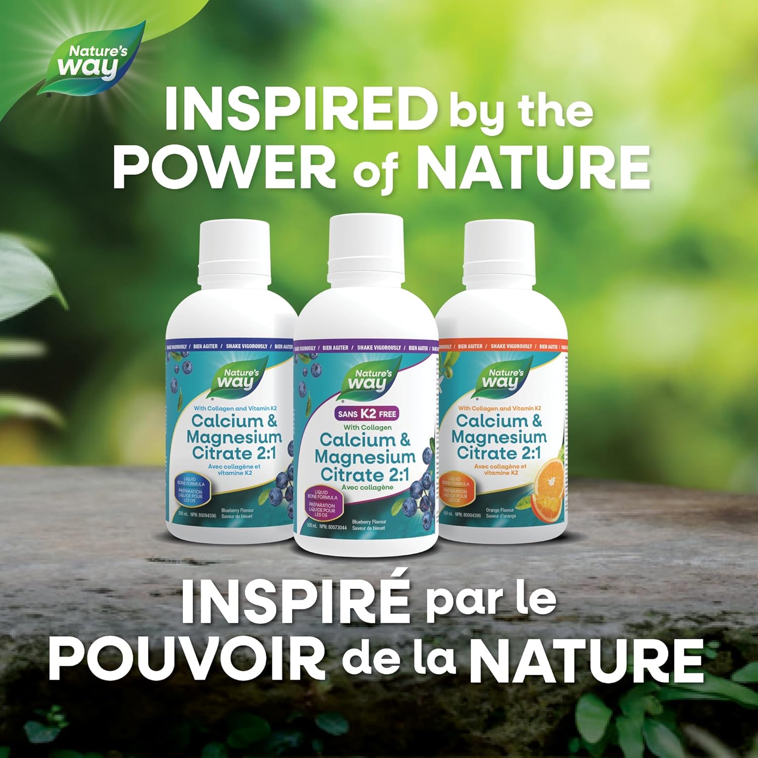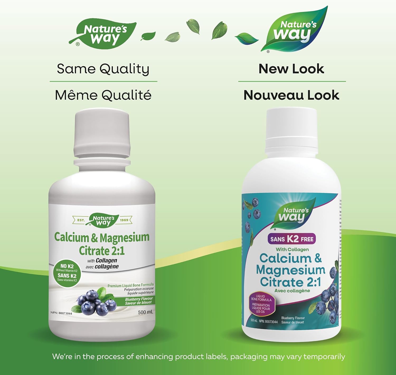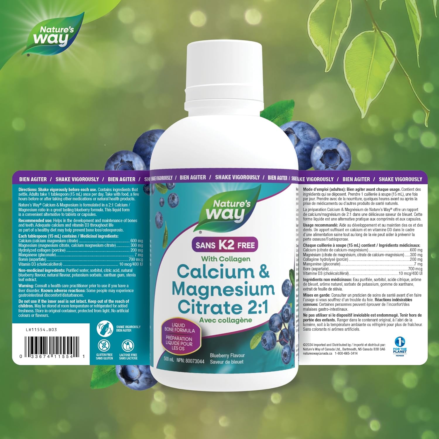 Nature's Way 檸檬酸鈣鎂 2:1 液體補充劑,含維生素 D3 和膠原蛋白,有助於維持骨骼和牙齒健康,不含維生素 K2,藍莓味,500 毫升